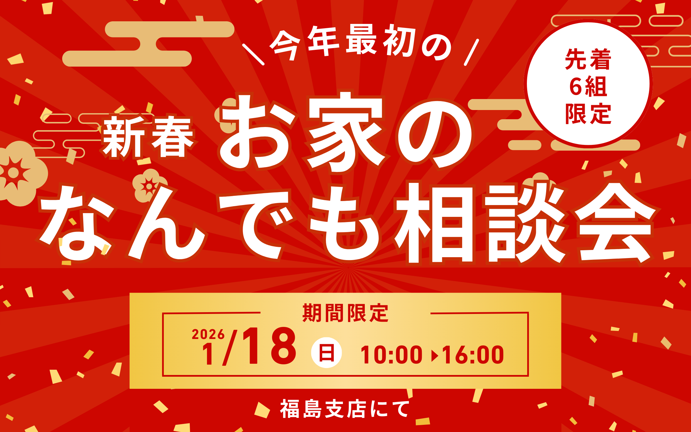 1月18日(日) 10:00~16:00 福島支店にて 新春 お家のなんでも相談会 先着6組限定! ご予約は下記のボタンをクリック! ハズレ無しの抽選会も実施!お米またはアマゾンギフトカードをプレゼント! 更に事前に打ち合わせ予約をいただいた方には商品券をプレゼント! 席に限りがございますので...