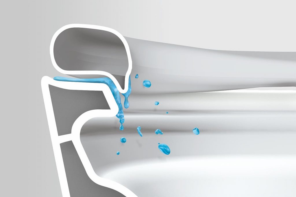 フチの立ち上がりで、外に垂れだしにくい「タレガード」