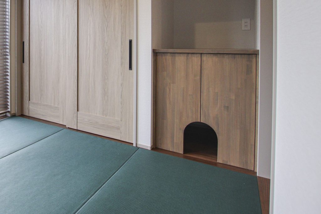 施工事例としてご紹介するのは、収納下に設けた猫ちゃんの食事スペース。