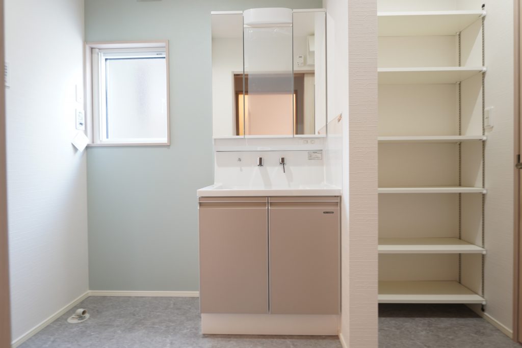 洗面台の横に可動棚を設置すればタオルやサニタリー用品を収納する事ができます。