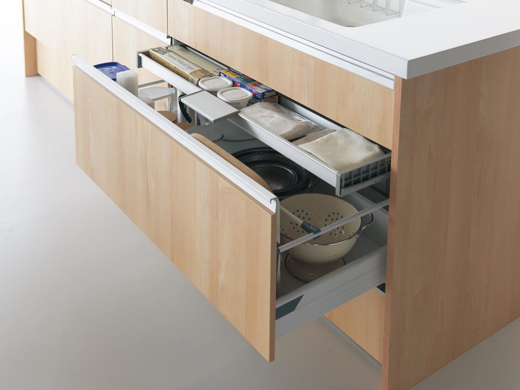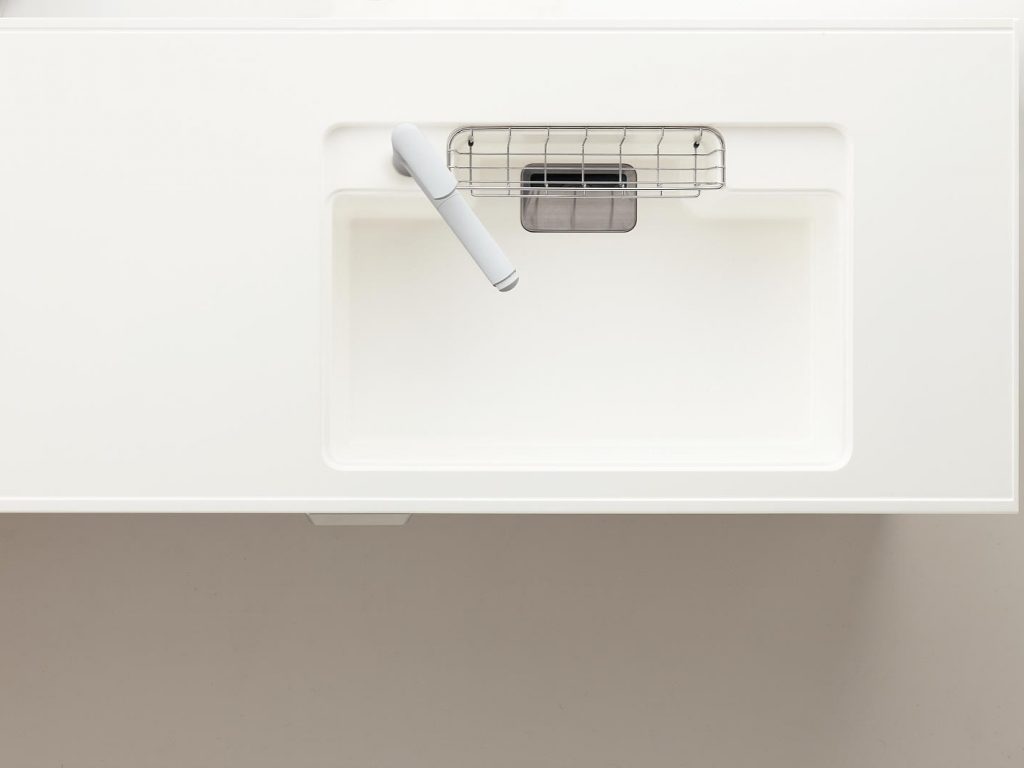 普段は、正面に置いてある洗剤ラックを、サイドに移動することにより、シンク中央が広々と使え、大きな鍋やまとめ洗いもゆったり洗いやすくなります。