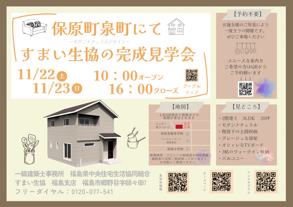 お知らせイベント【福島支店】11月22日・23日伊達市保原町にて完成見学会を開催いたします★ 2025 11.07 イベント 【福島支店】11月22日・23日伊達市保原町にて完成見学会を開催いたします★ こんにちは! すまい生協 福島支店です。 11月22日(土)・23日(日)伊達市保原町字泉町にて2階建ての完成見学会を開催いたします。 詳細は下記ボタンをクリックください! 前の記事を見る 一覧に戻る 次の記事を見る