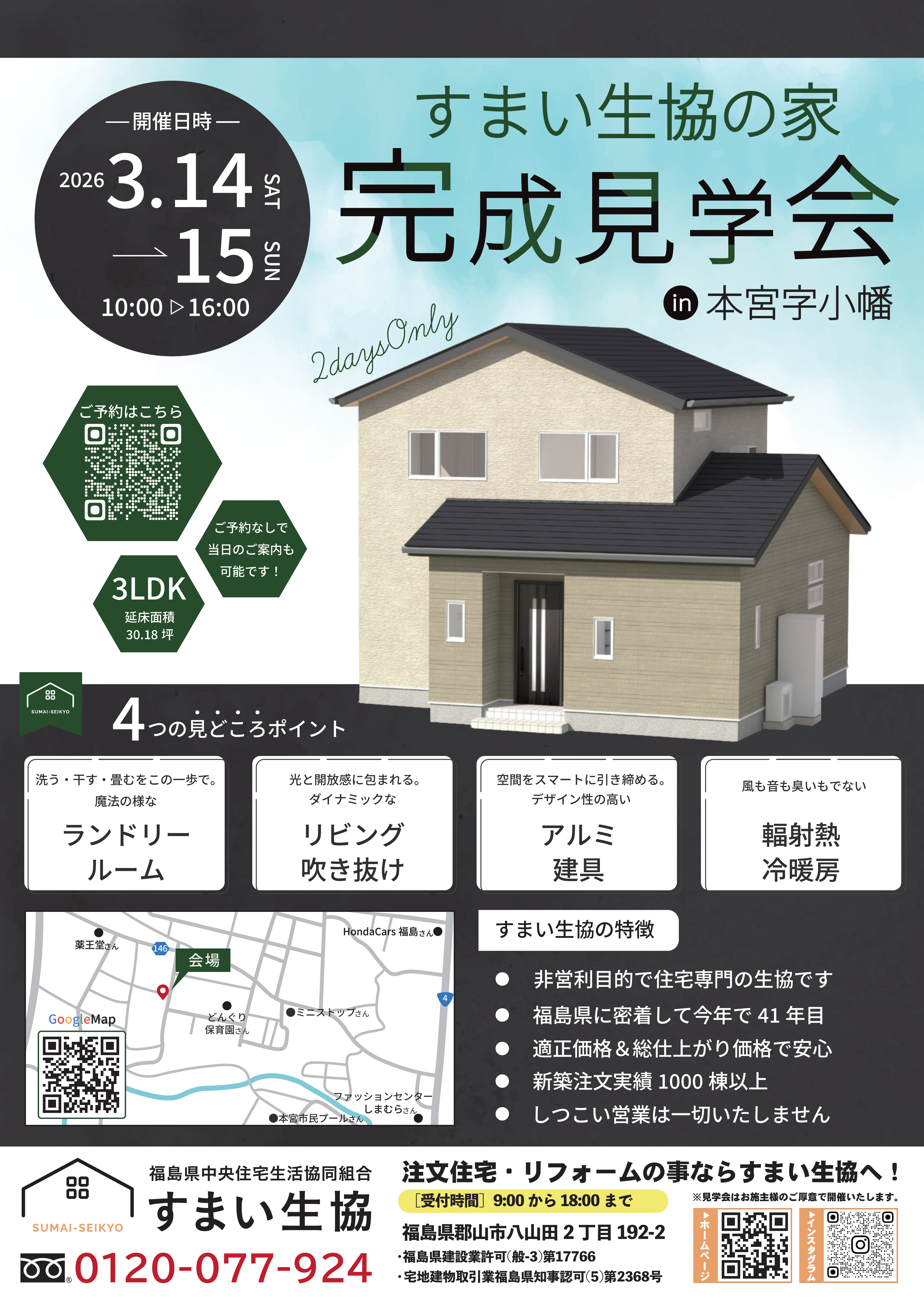 【郡山本店】3月14日・15日本宮市にて完成見学会を開催いたします