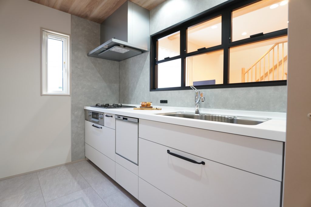 キッチン室内窓: お料理中も家族の気配を感じられ、光も抜けるおしゃれなアクセント。