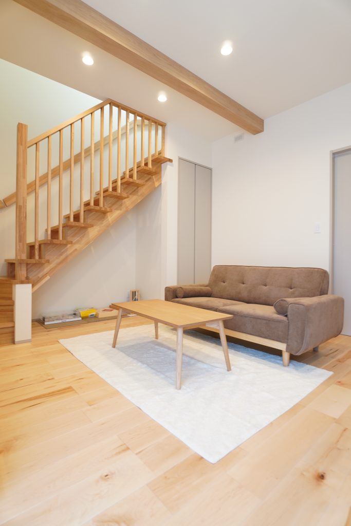 木製オープン階段: ナチュラルな木の質感がリビングに溶け込み、インテリアの主役になっています。