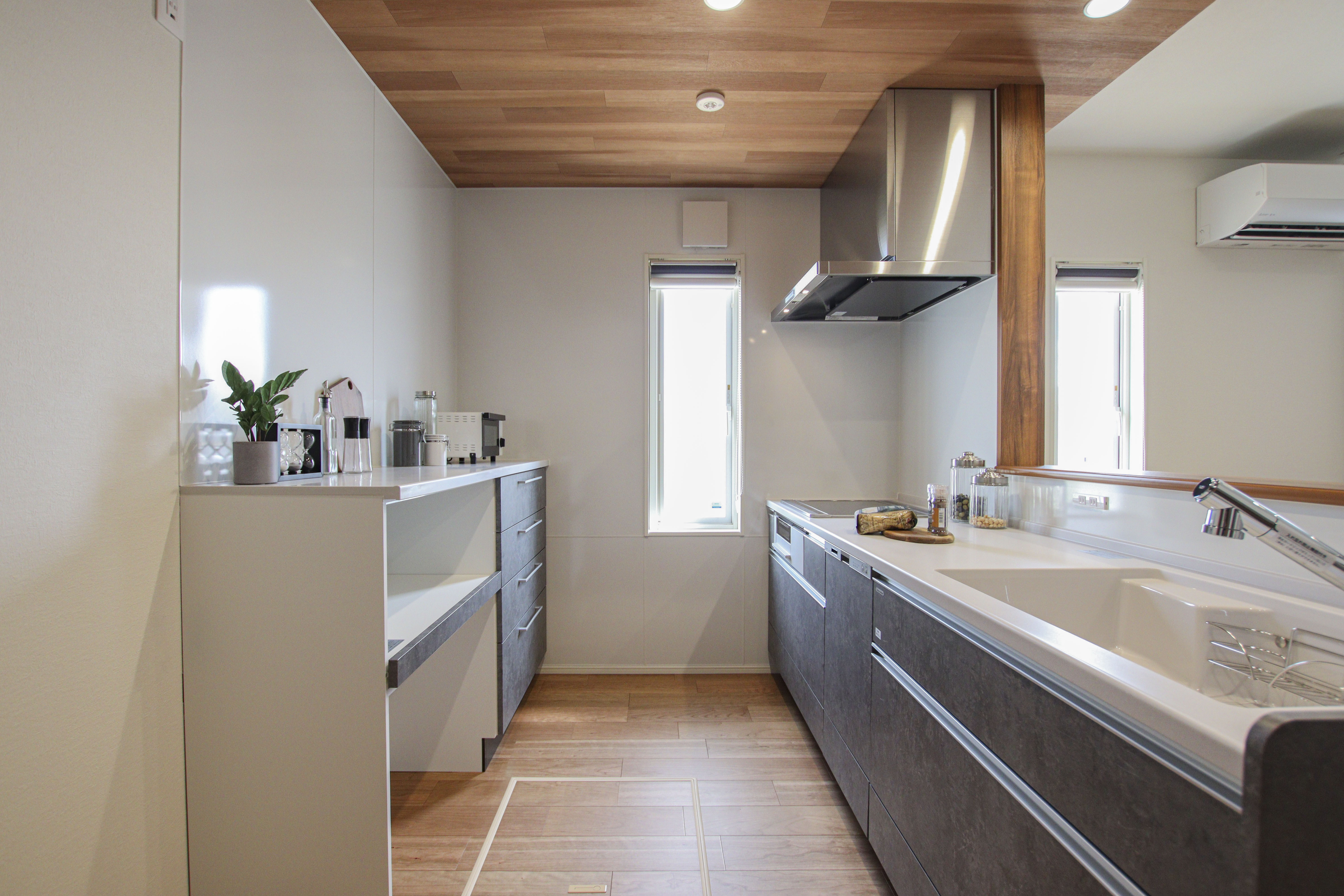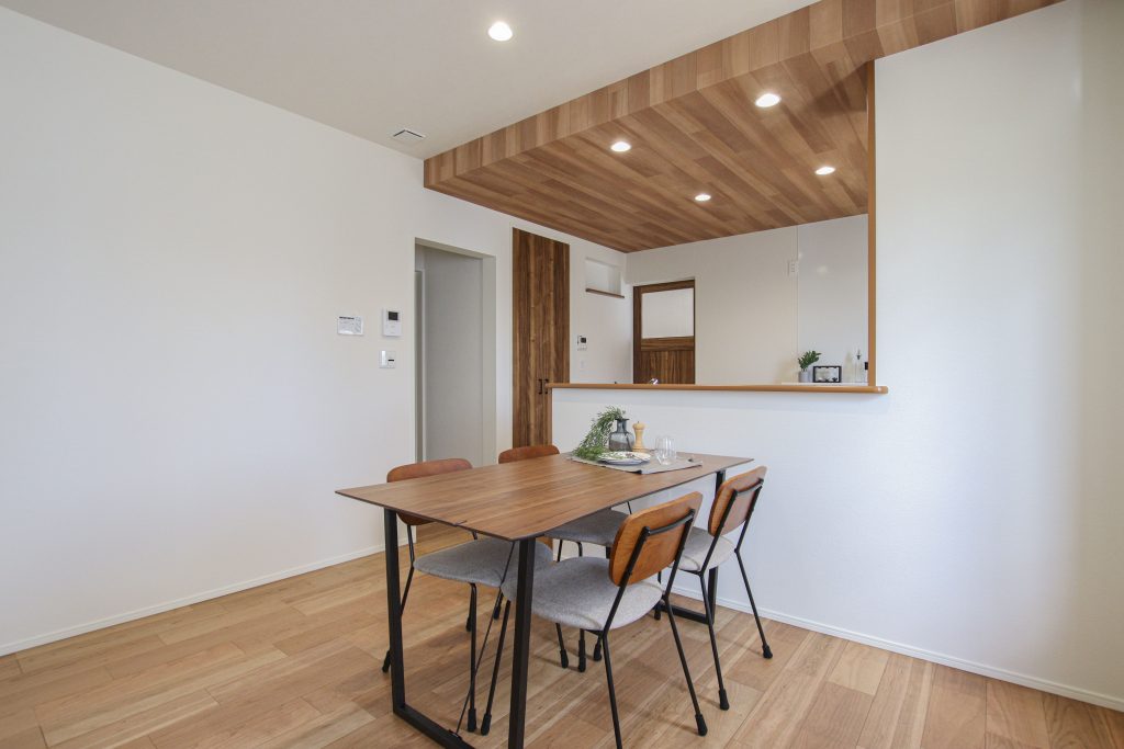 キッチン部分は空間のアクセントにもなる下がり天井のため、ダイニングとの空間をさりげなく区切っています。