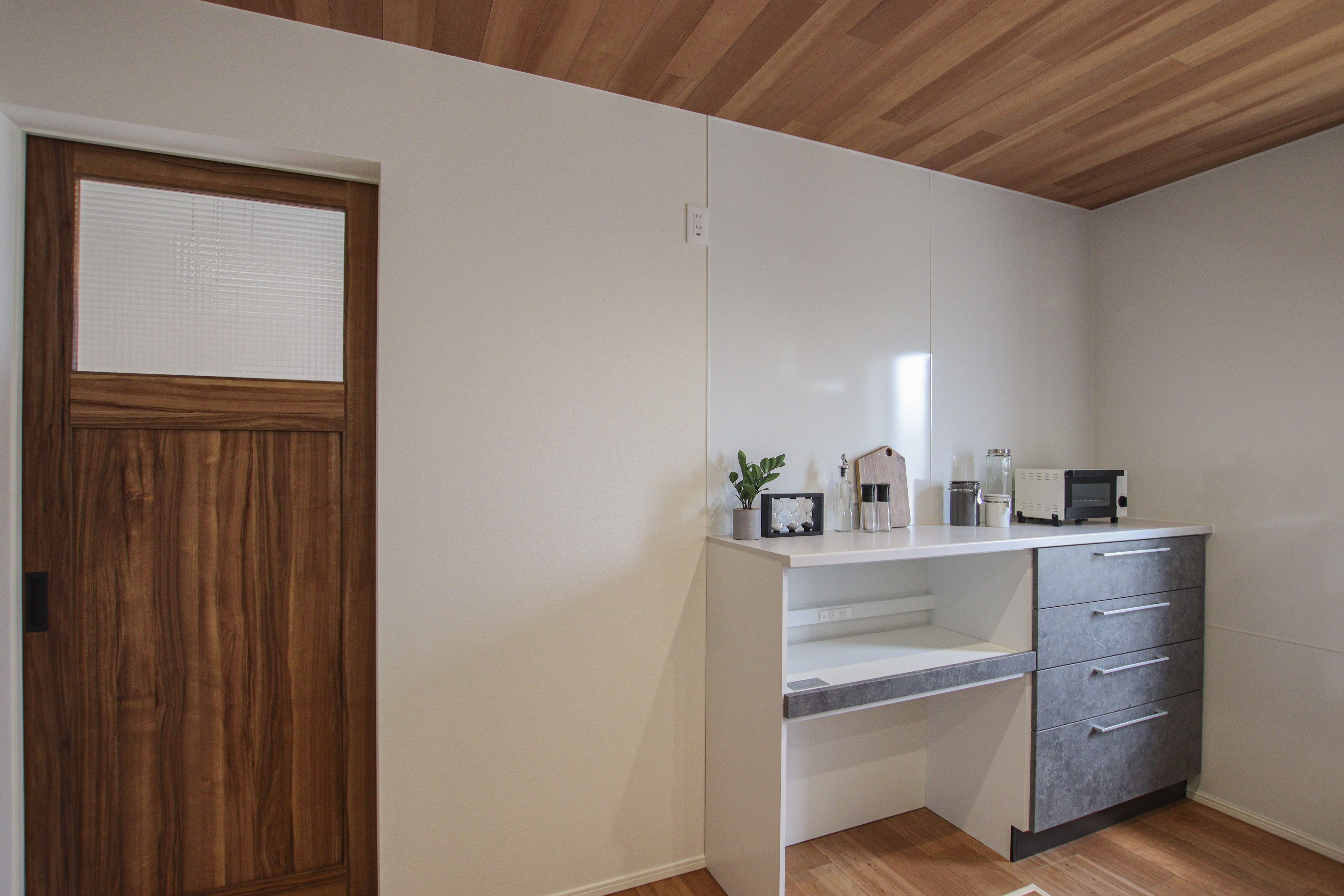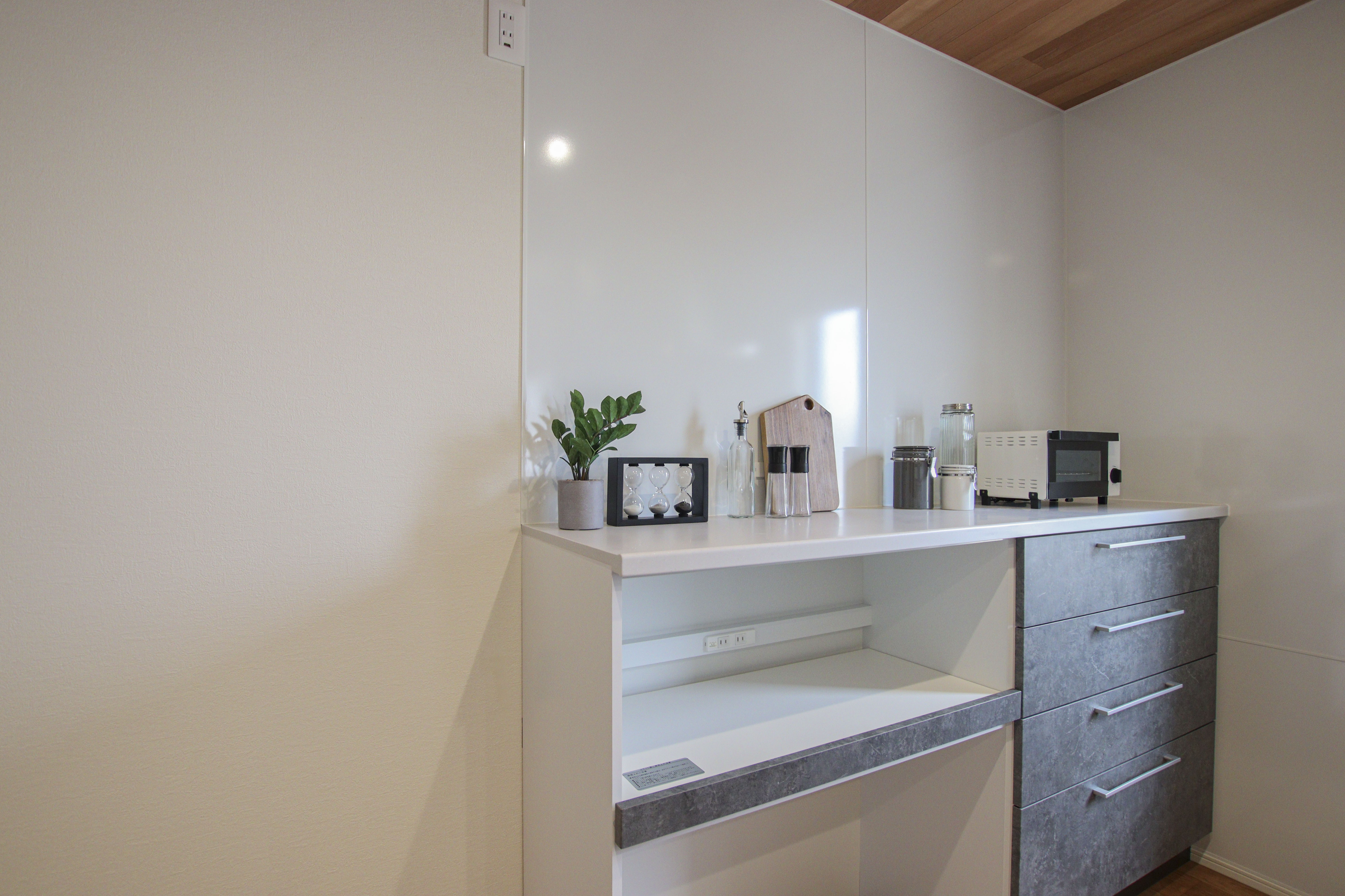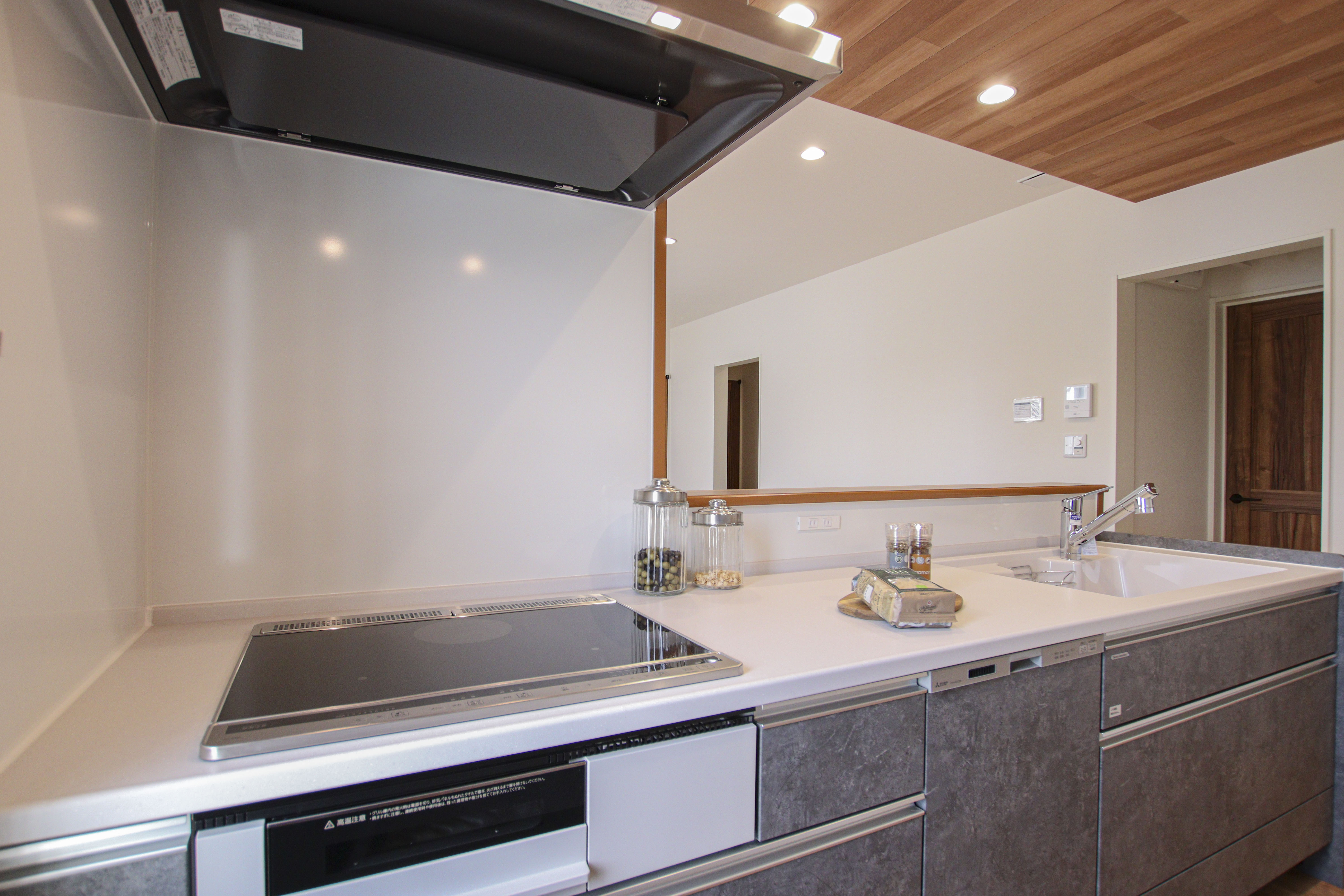 カップボード側までキッチンパネルを貼り、油がはねてしまってもサッと拭き取ることができます。