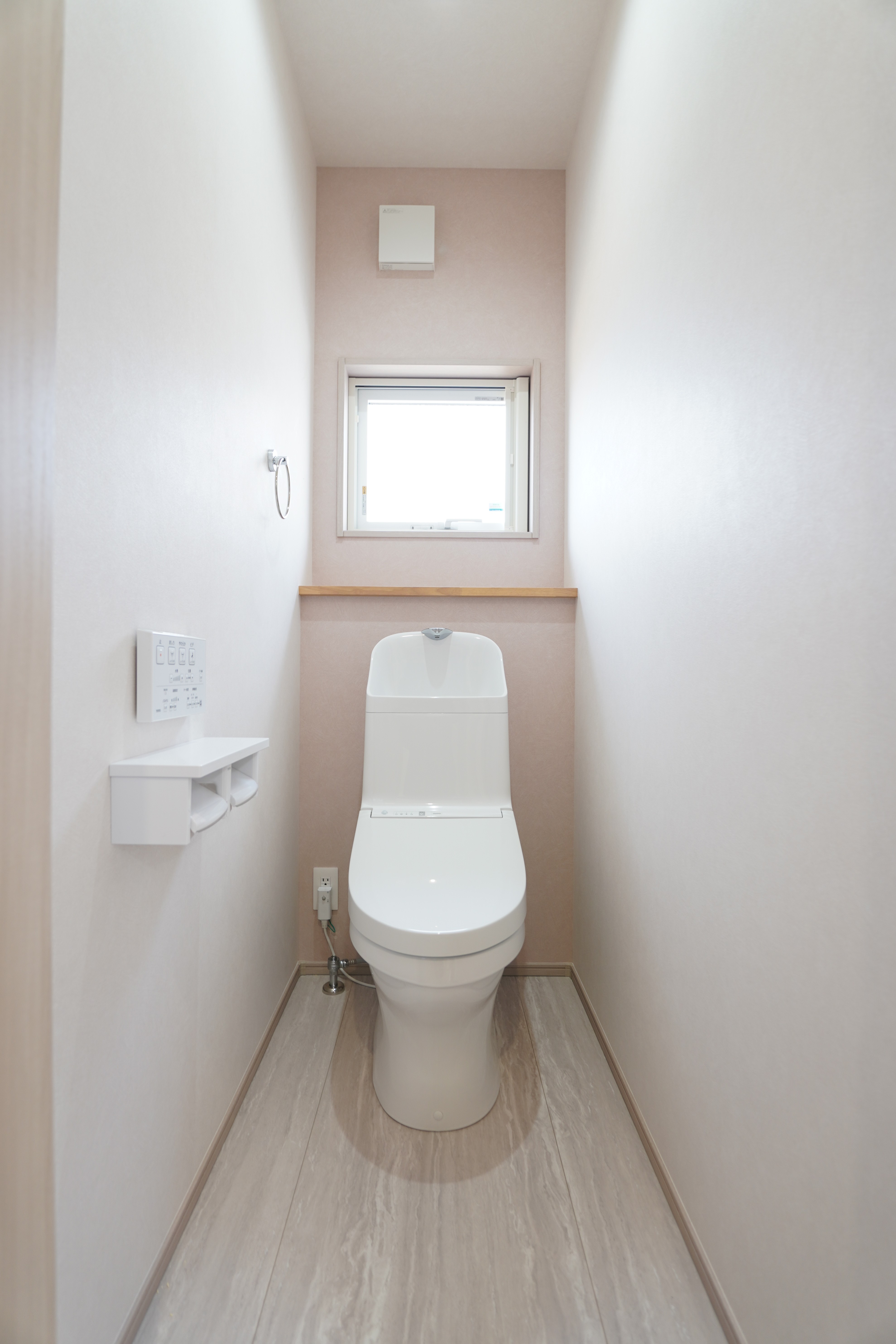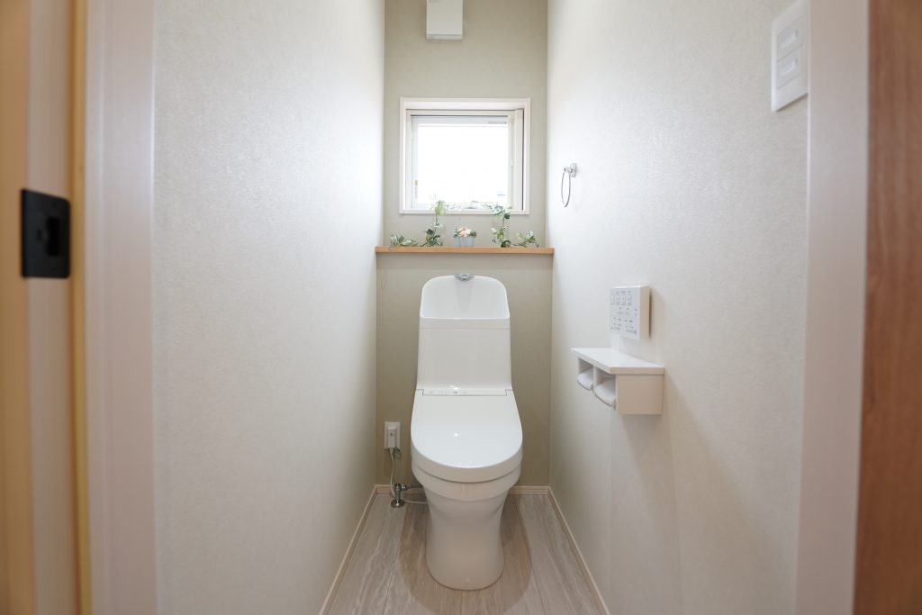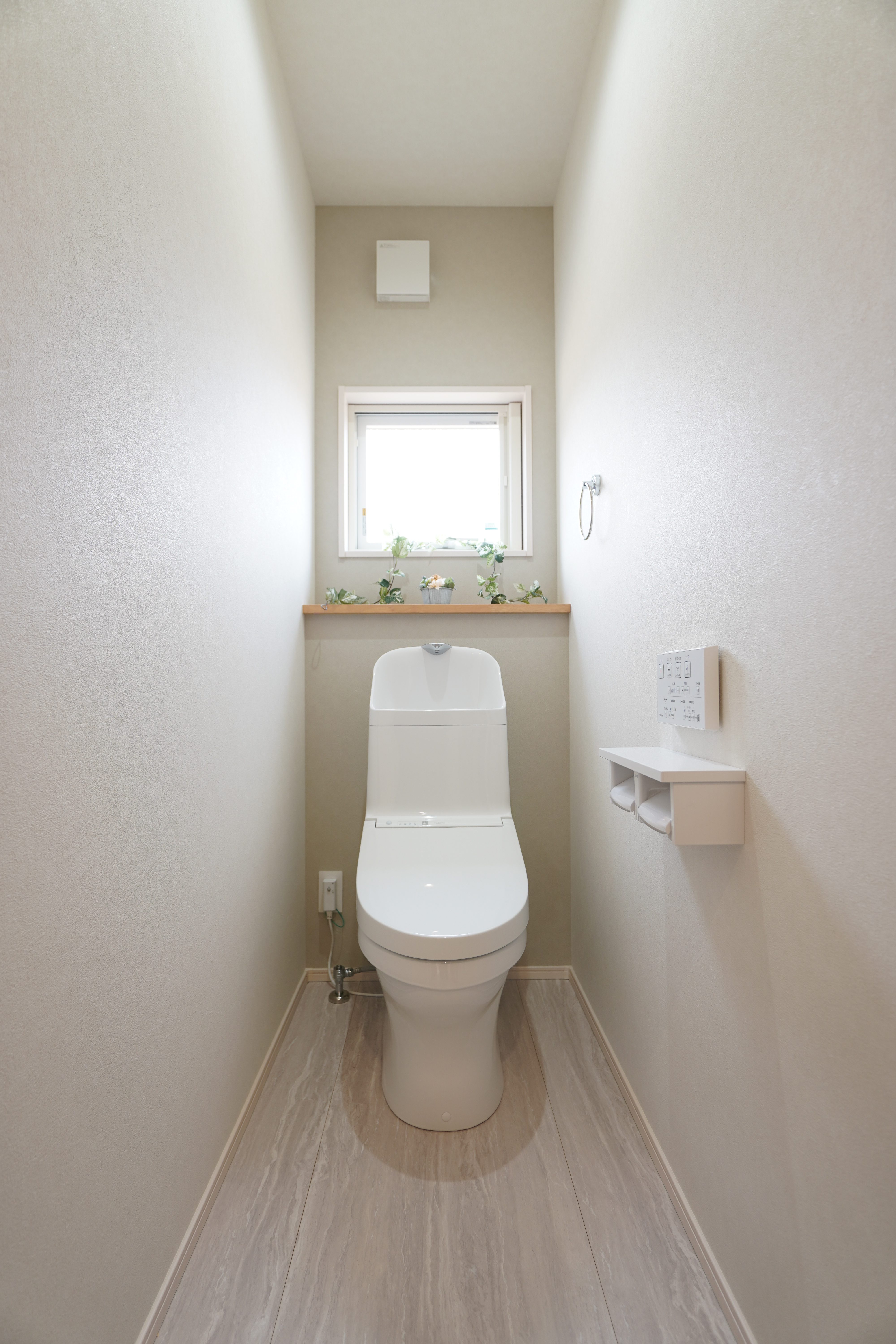 トイレ背面に腰壁を設けてあるので、小物を飾ったりトイレットペーパーを置いたりすることもできます。