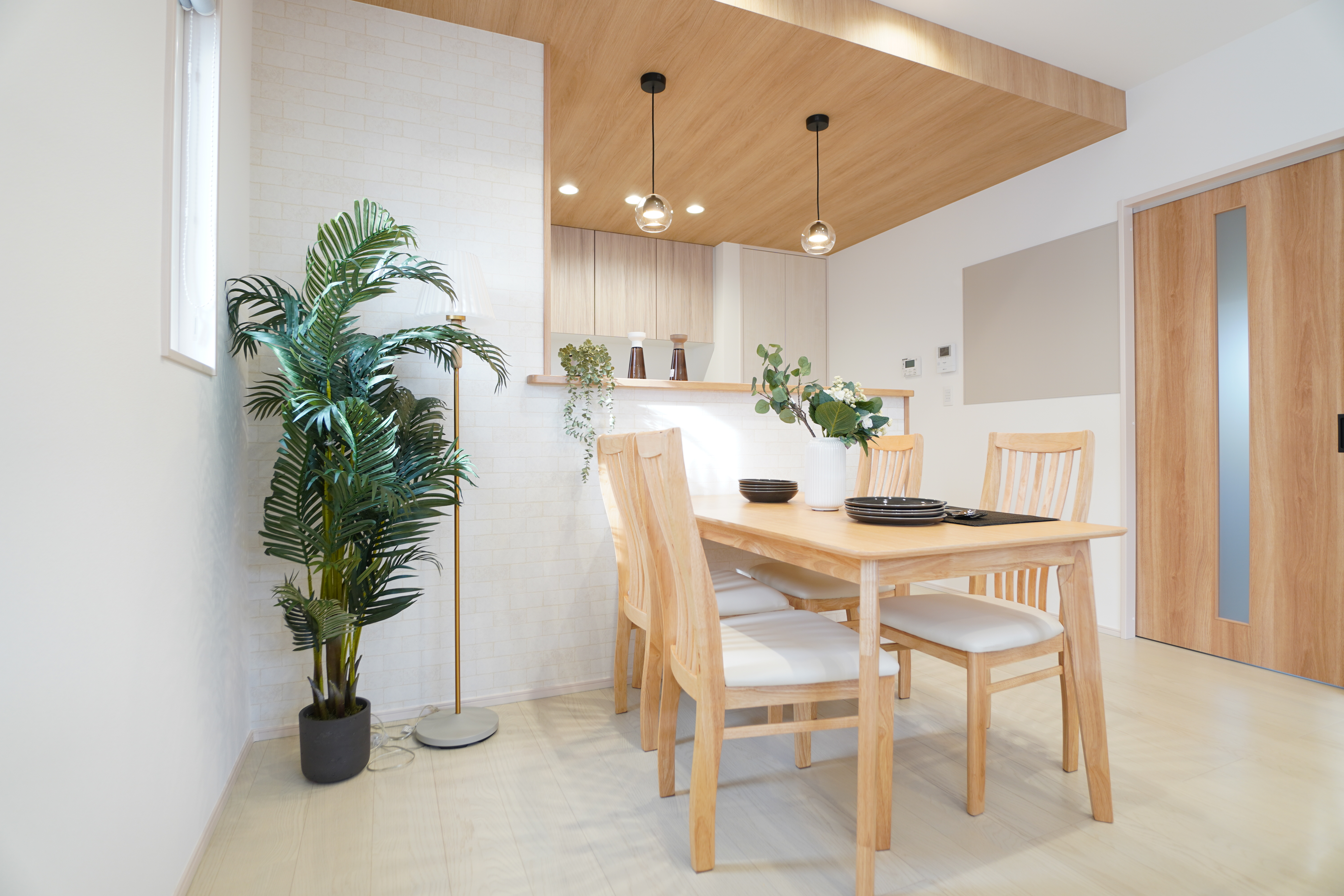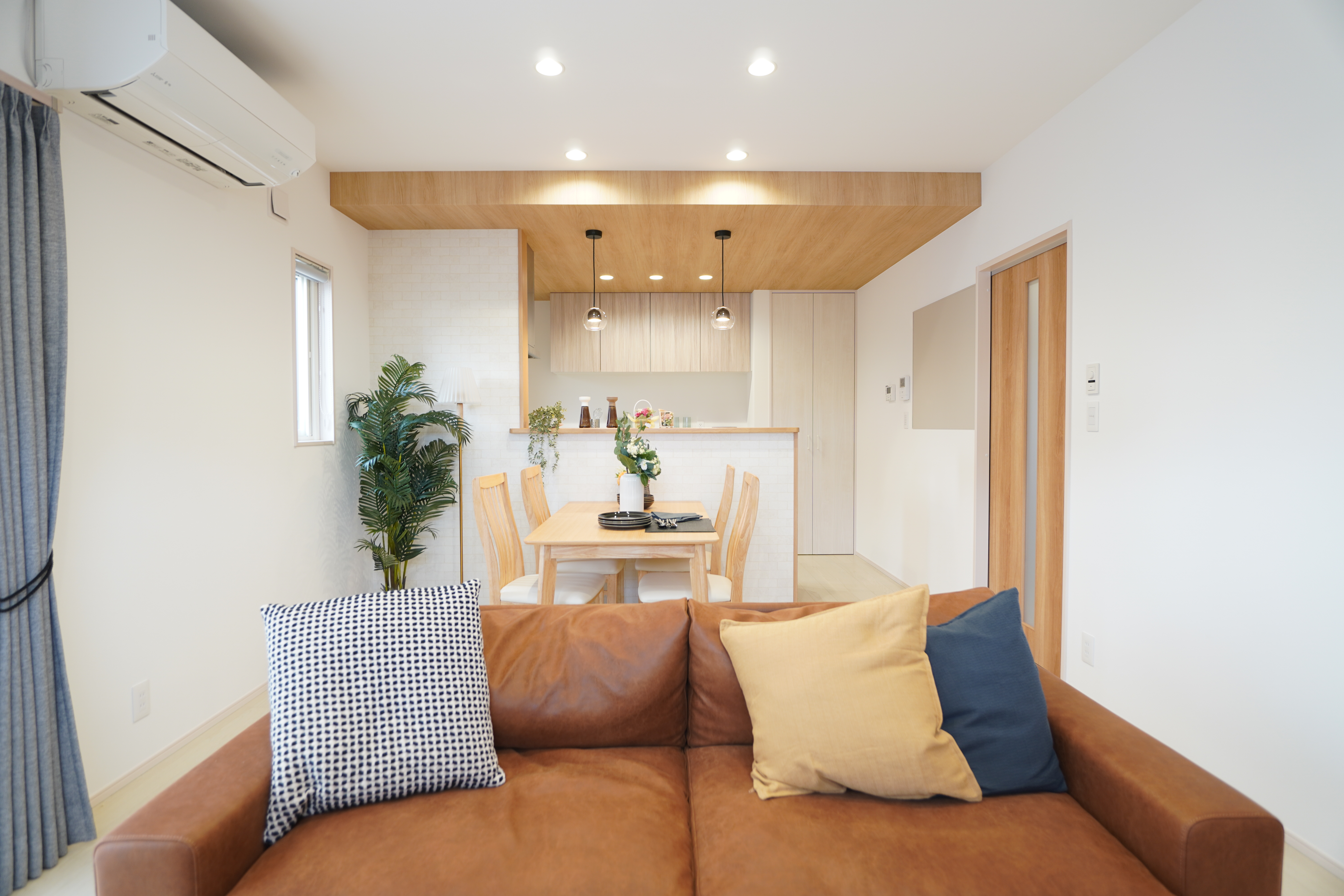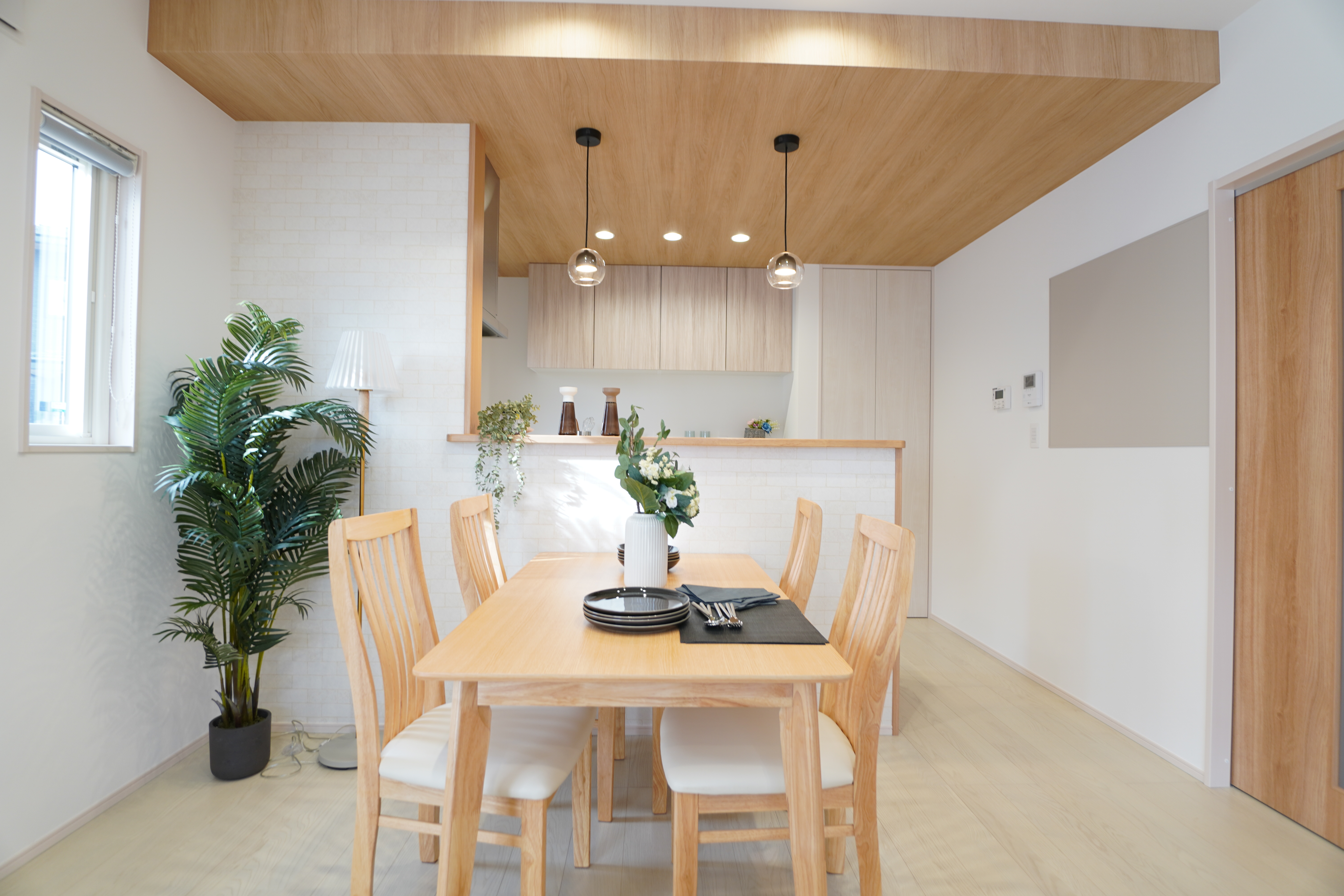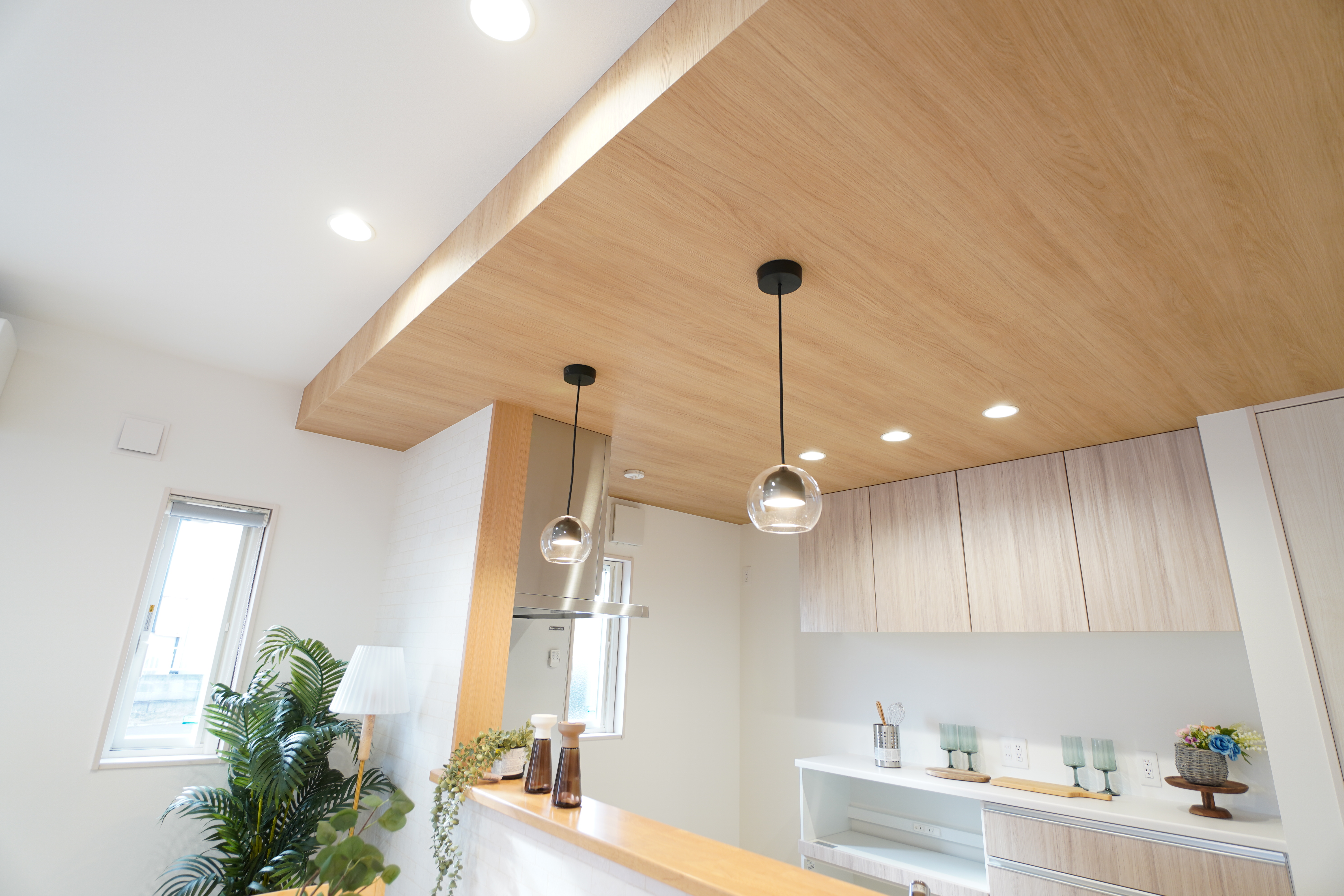 下がり天井やペンダントライトがアクセントになっており、お部屋に立体感を出しました。