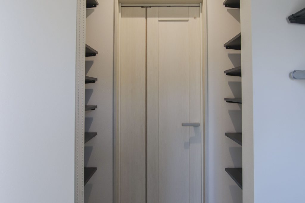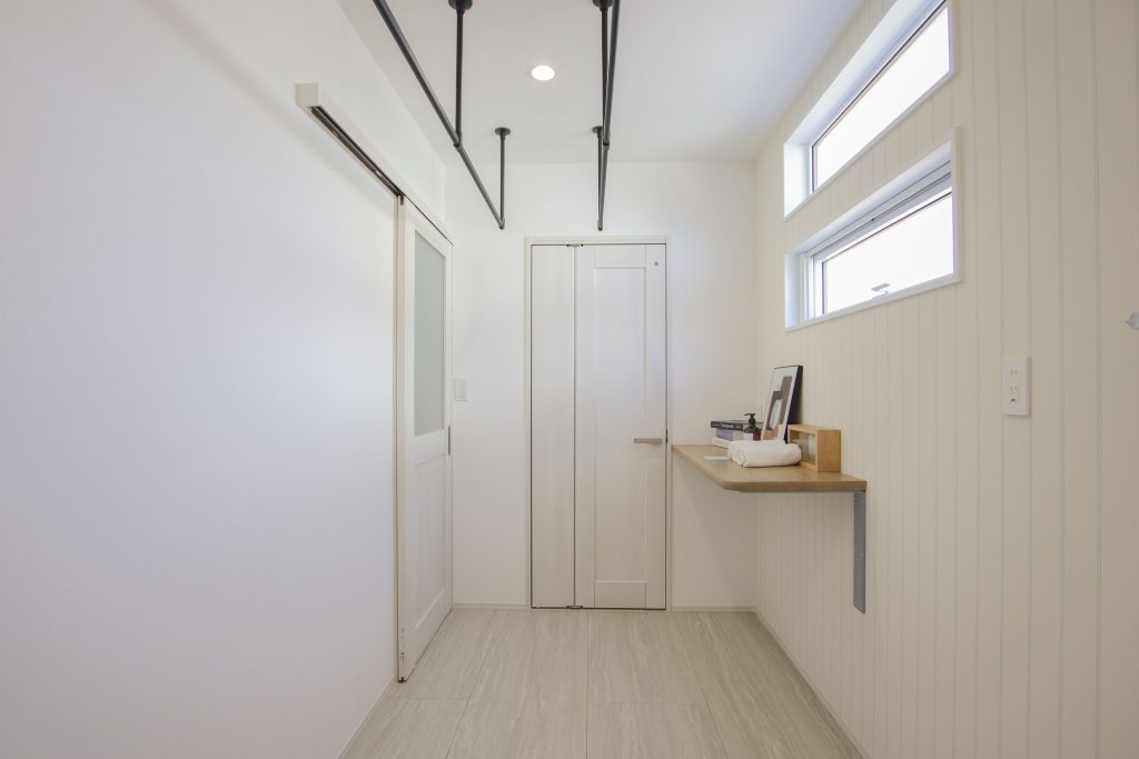 アイアンバーを設けたランドリーのすぐ横に収納を配置。