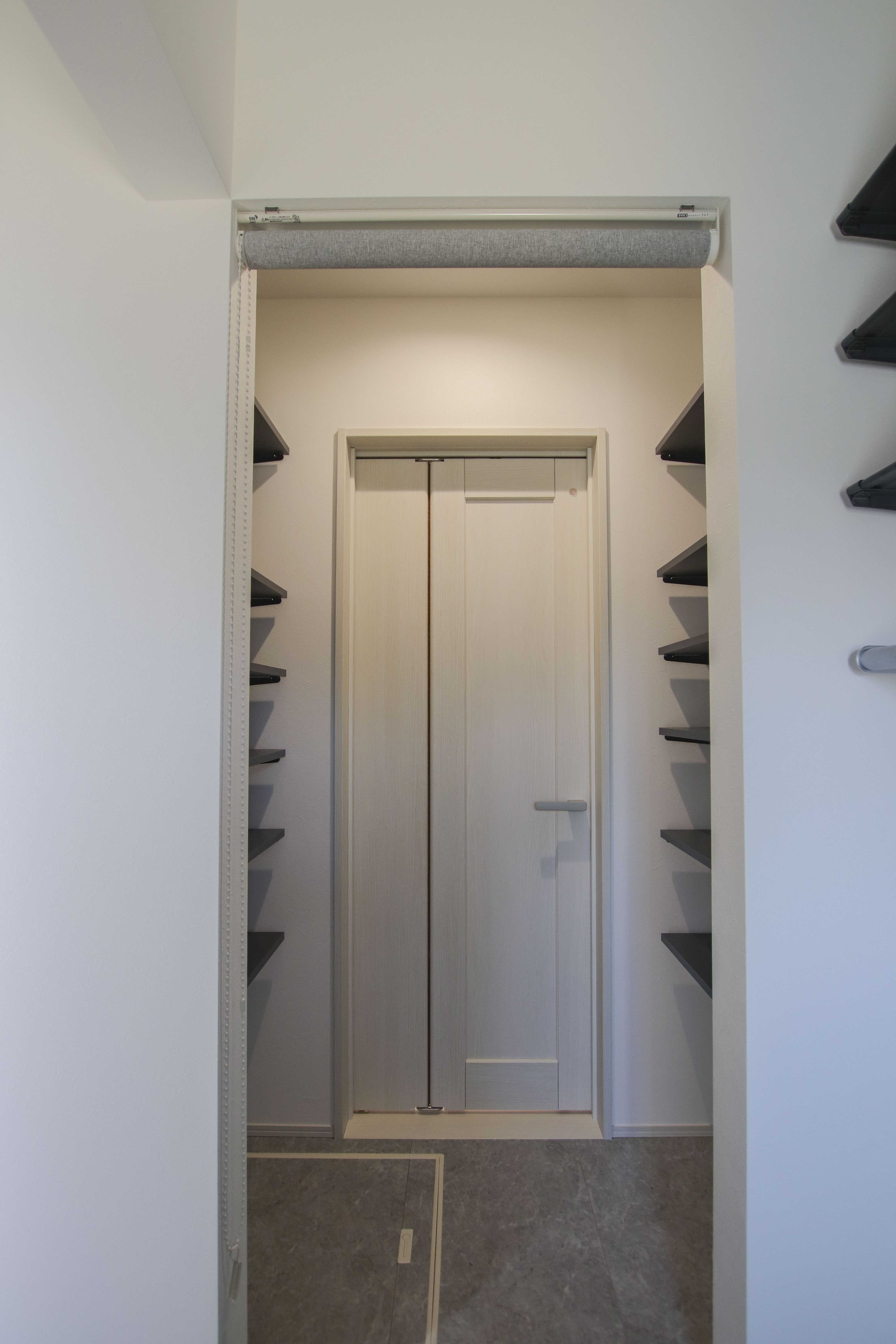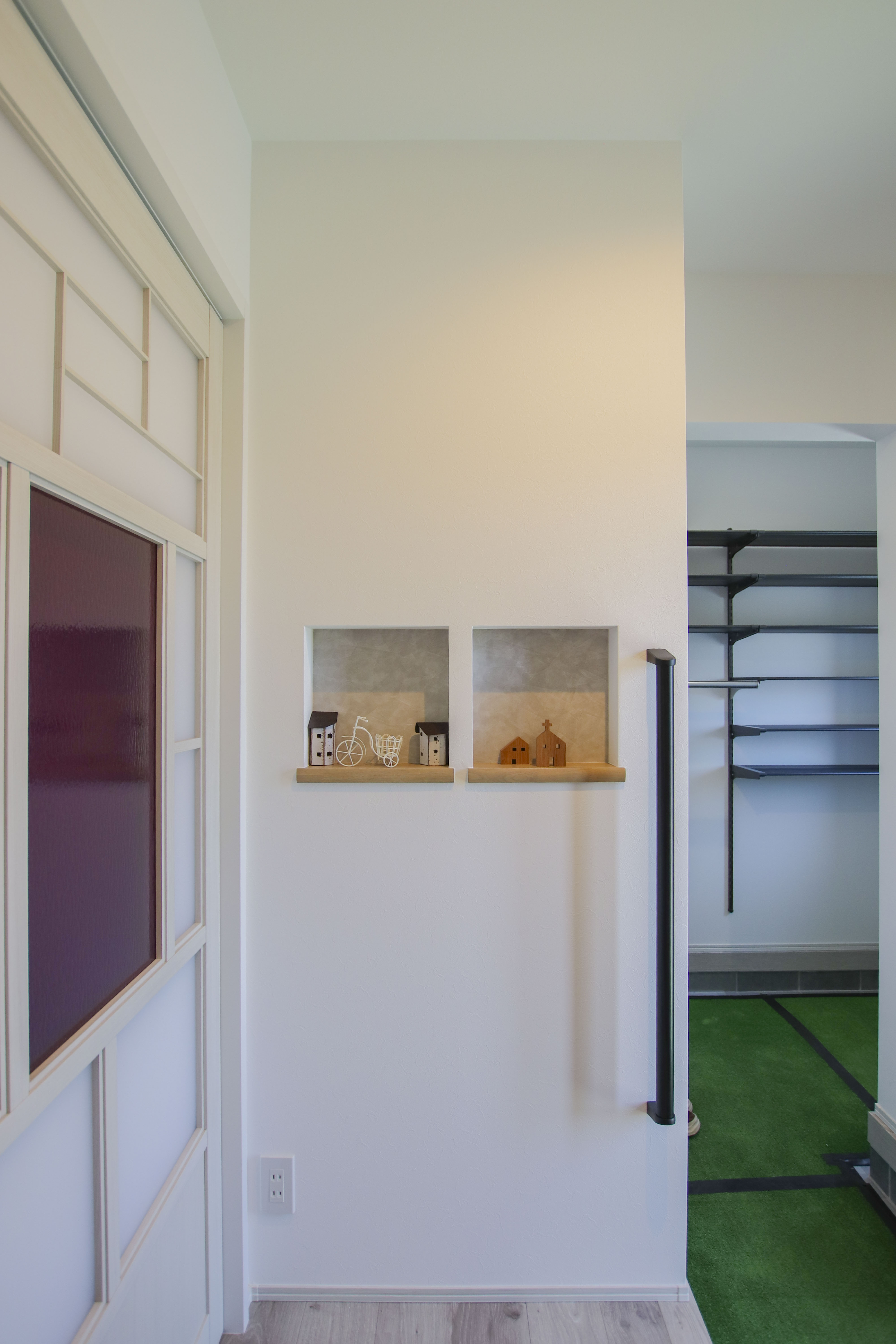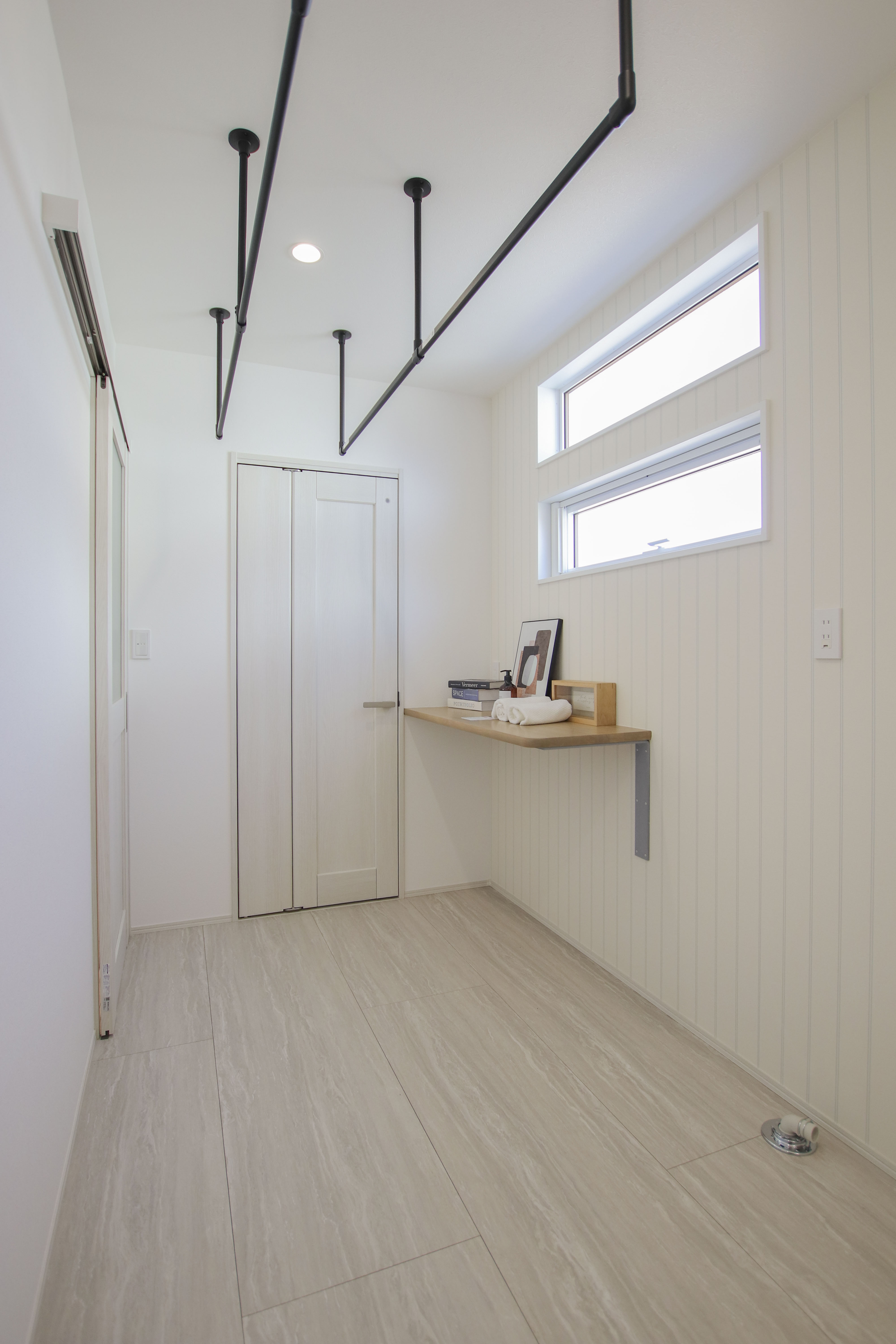 アイアンバーを設けたランドリーのすぐ横に収納を配置。