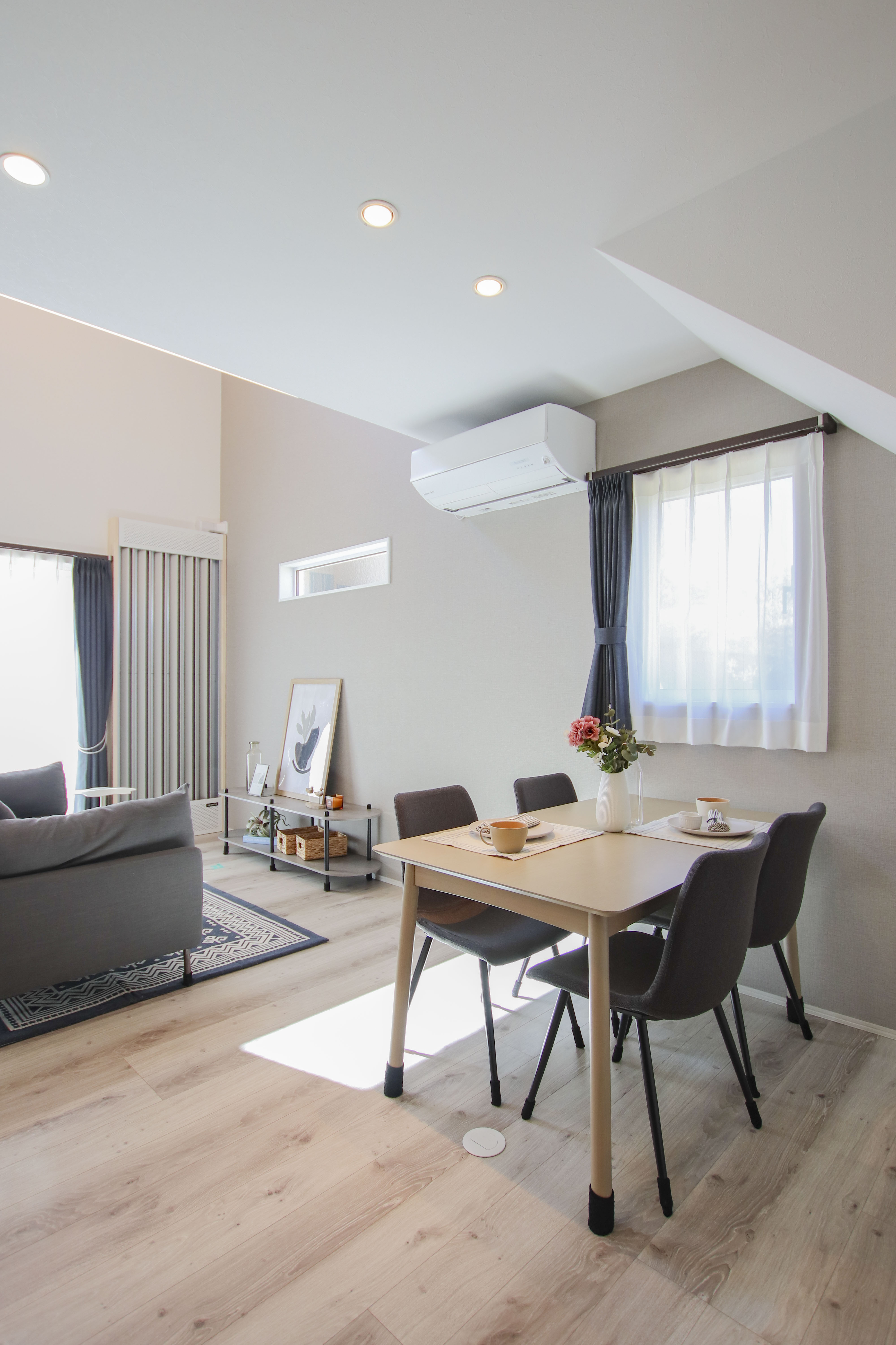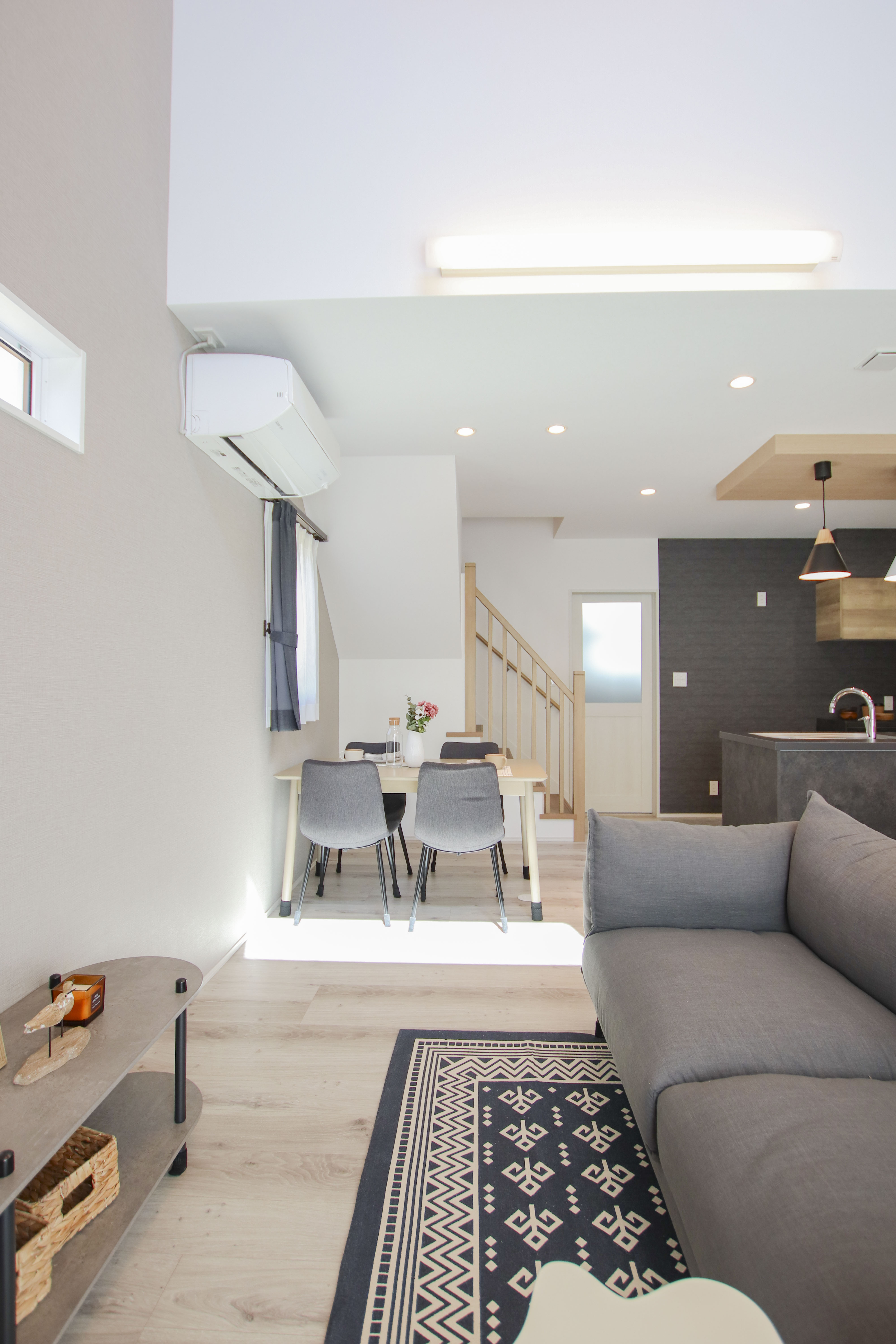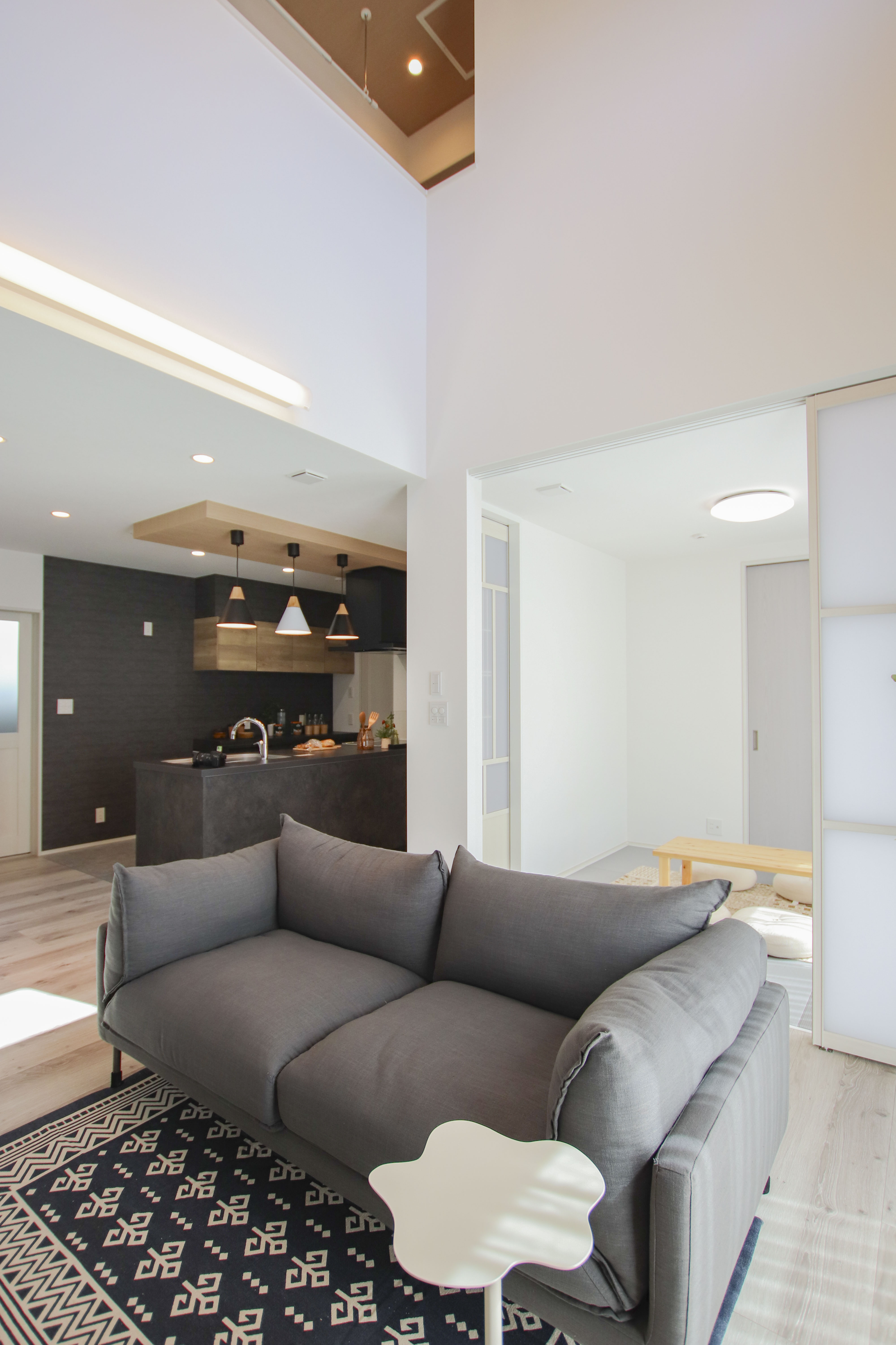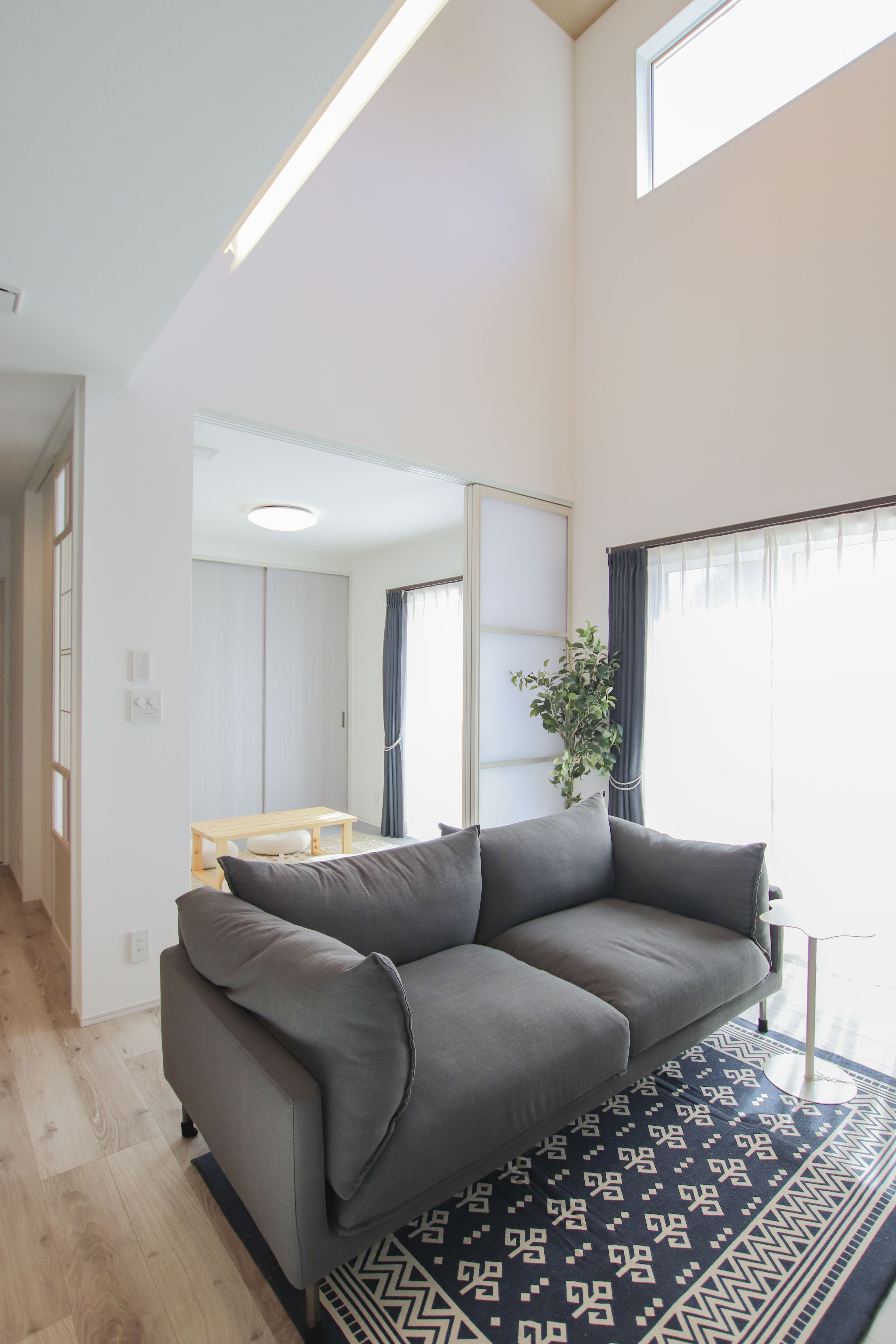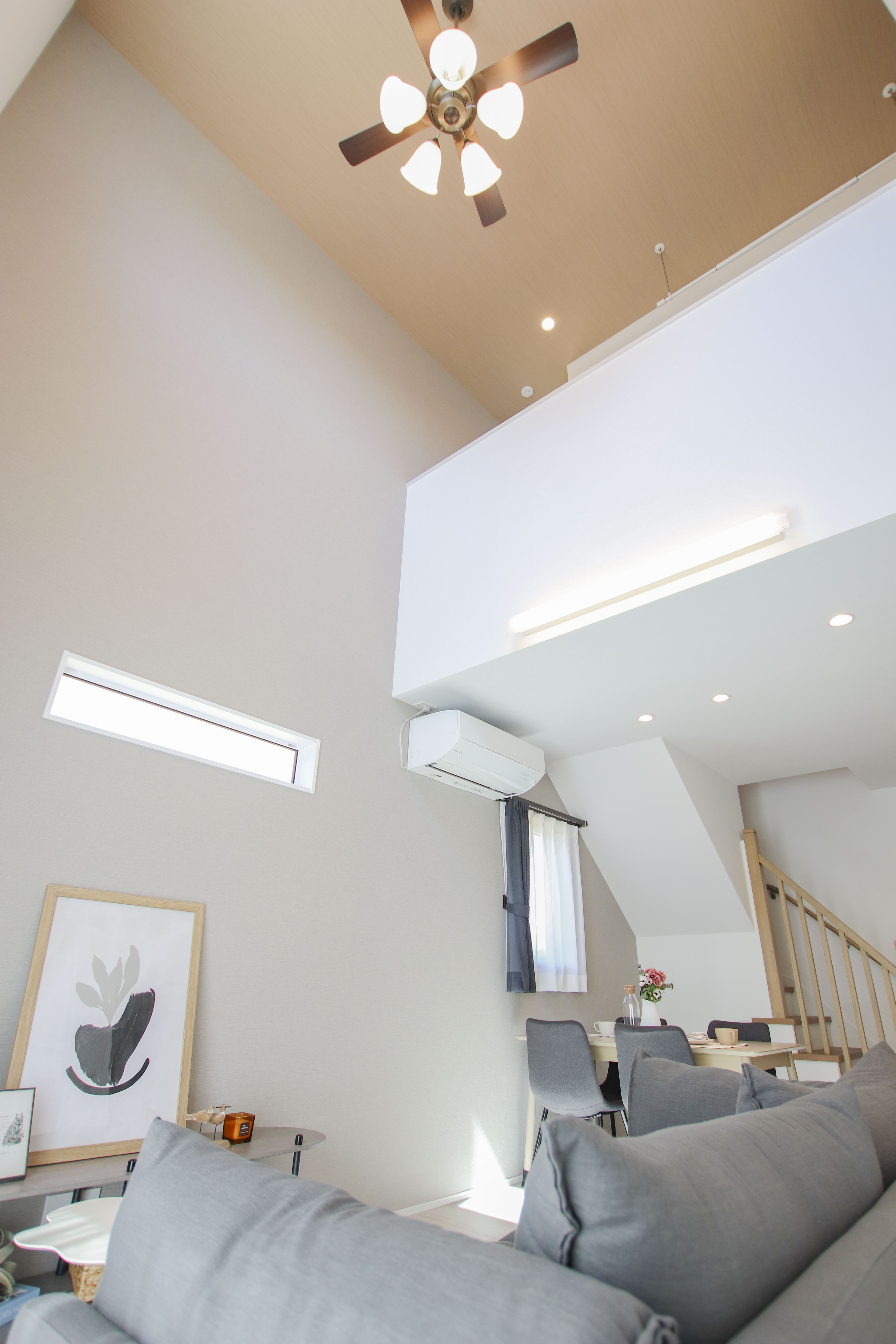 こちらのお住まいで特に印象的なのは、リビングの吹き抜けからスッと伸びる光の陰影です。