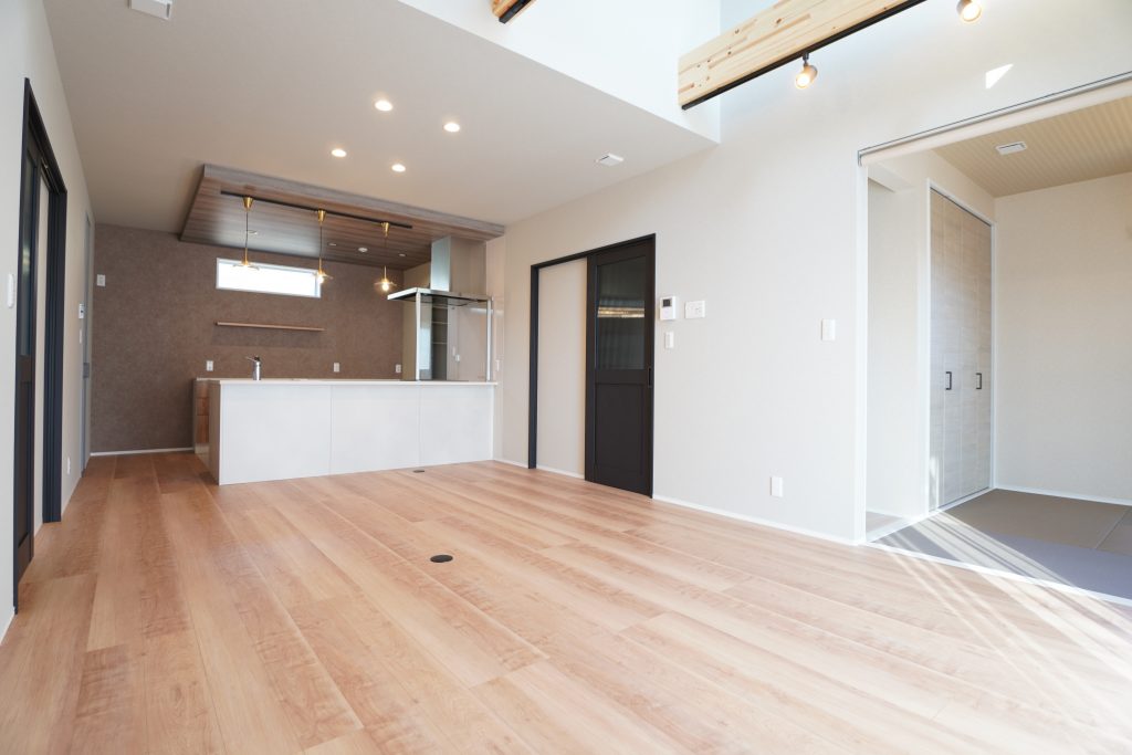吹き抜けのある18帖のLDKがある魅力的な一戸建て。