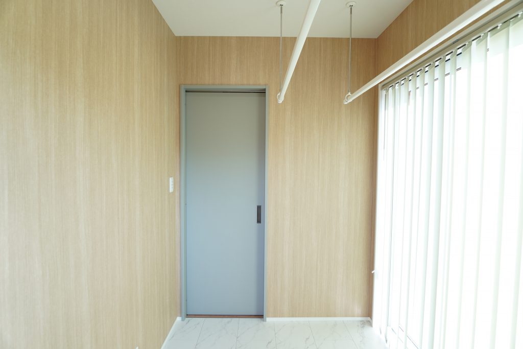 南側に配置したランドリールームは、バーチカルブラインドから入る光の調整がしやすく、室内干しでも驚くほどカラッと乾きます。