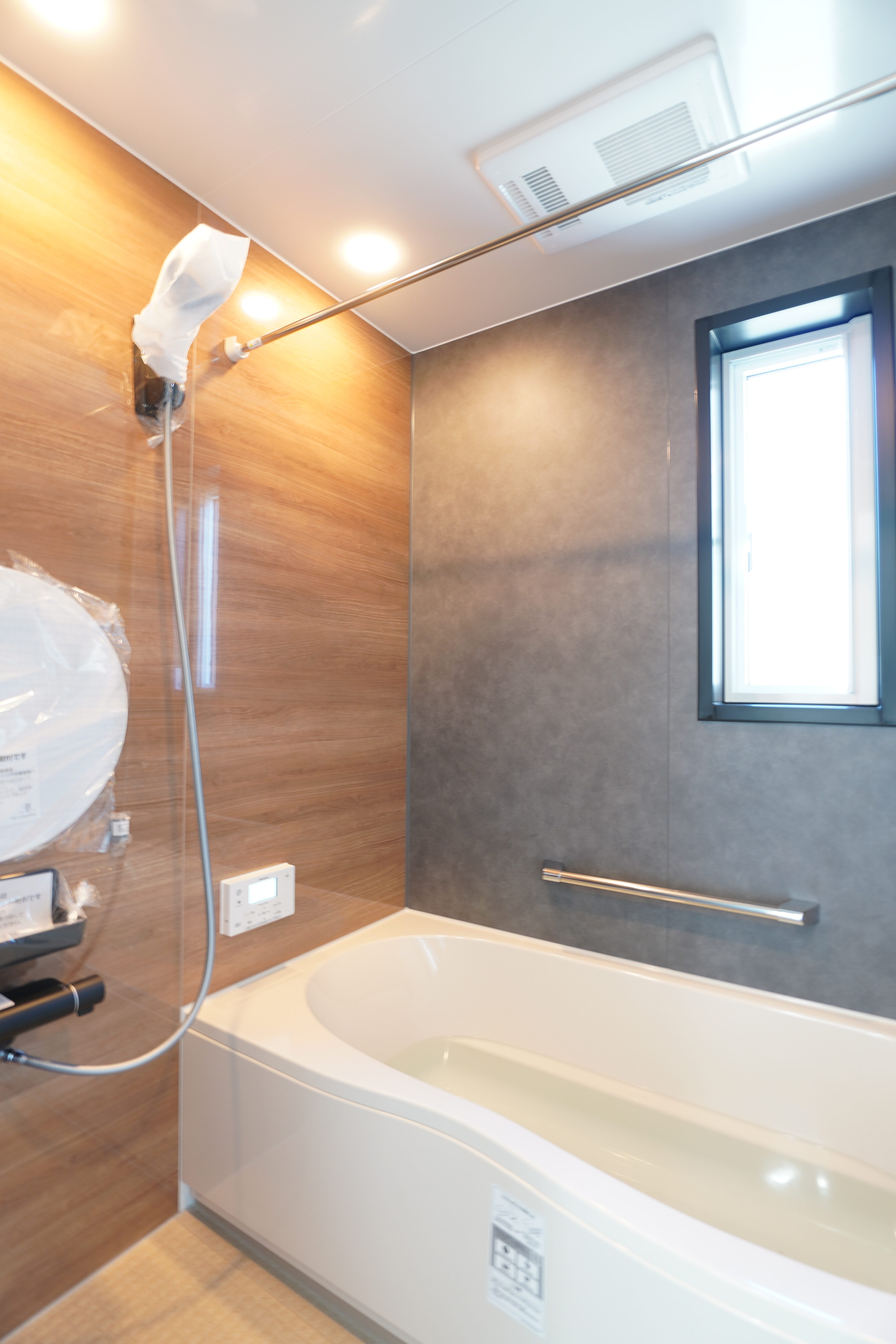 落ち着いた「モルティオダーク」のアクセントパネルに、柔らかなベージュの浴槽が調和し、まるでホテルのスパのような静寂な空間を演出します。