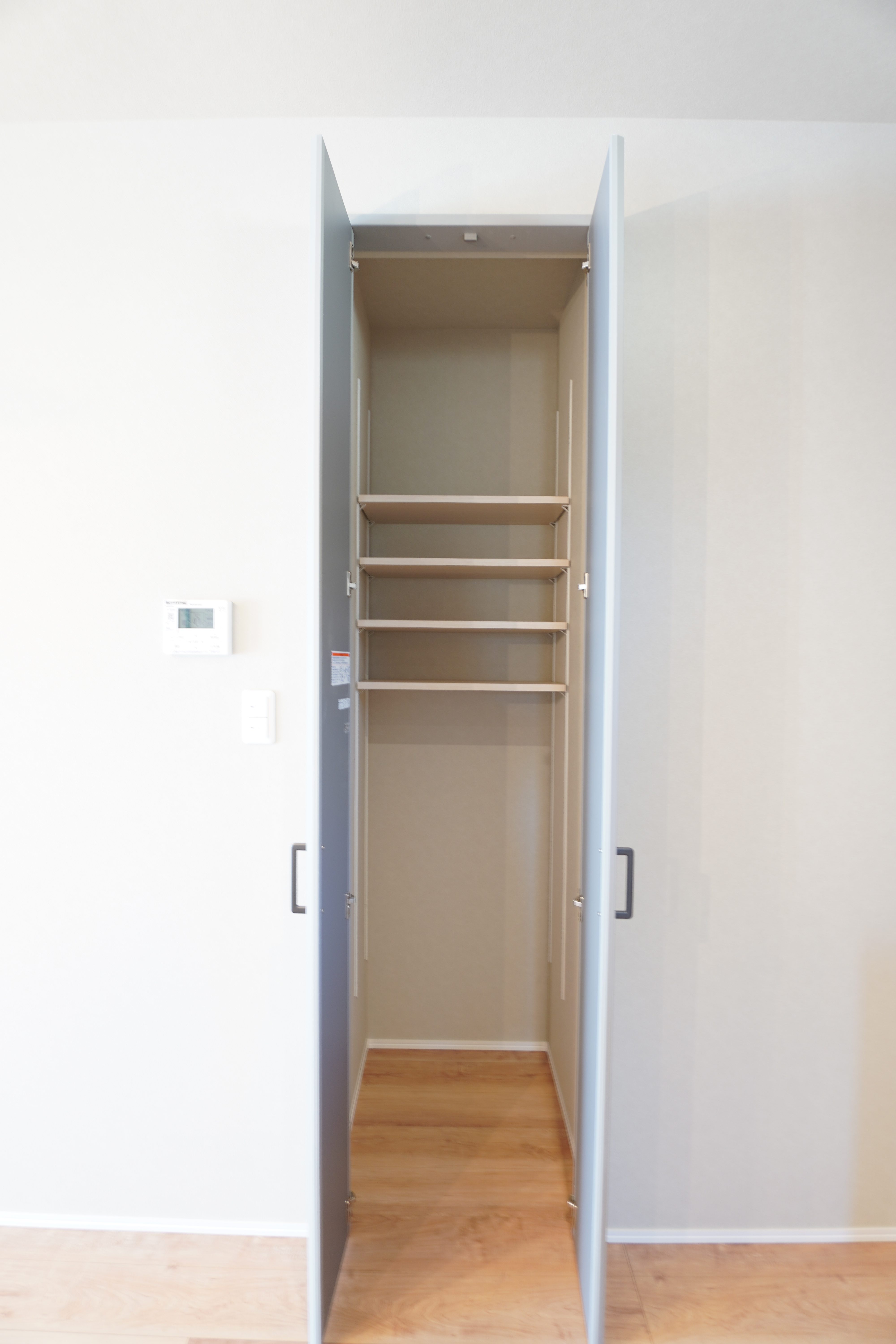 4段の可動棚にはお風呂上がりのタオルや着替え、日用品のストックなどを、手に取りやすい高さで整理整頓できます。