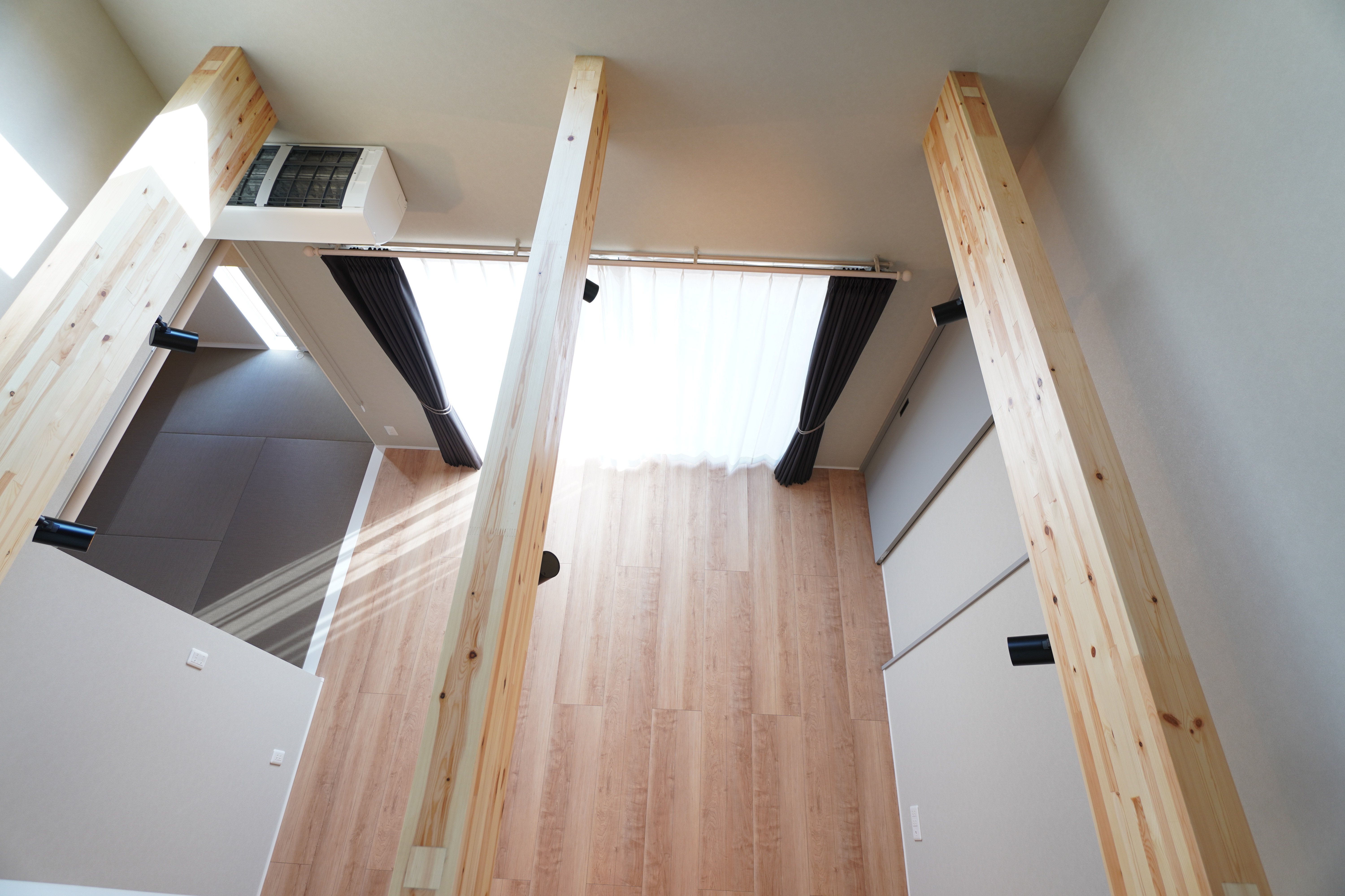 リビング部分は開放感あふれる吹き抜けになっており、天井に配した「化粧梁」が木の温もりを強調。