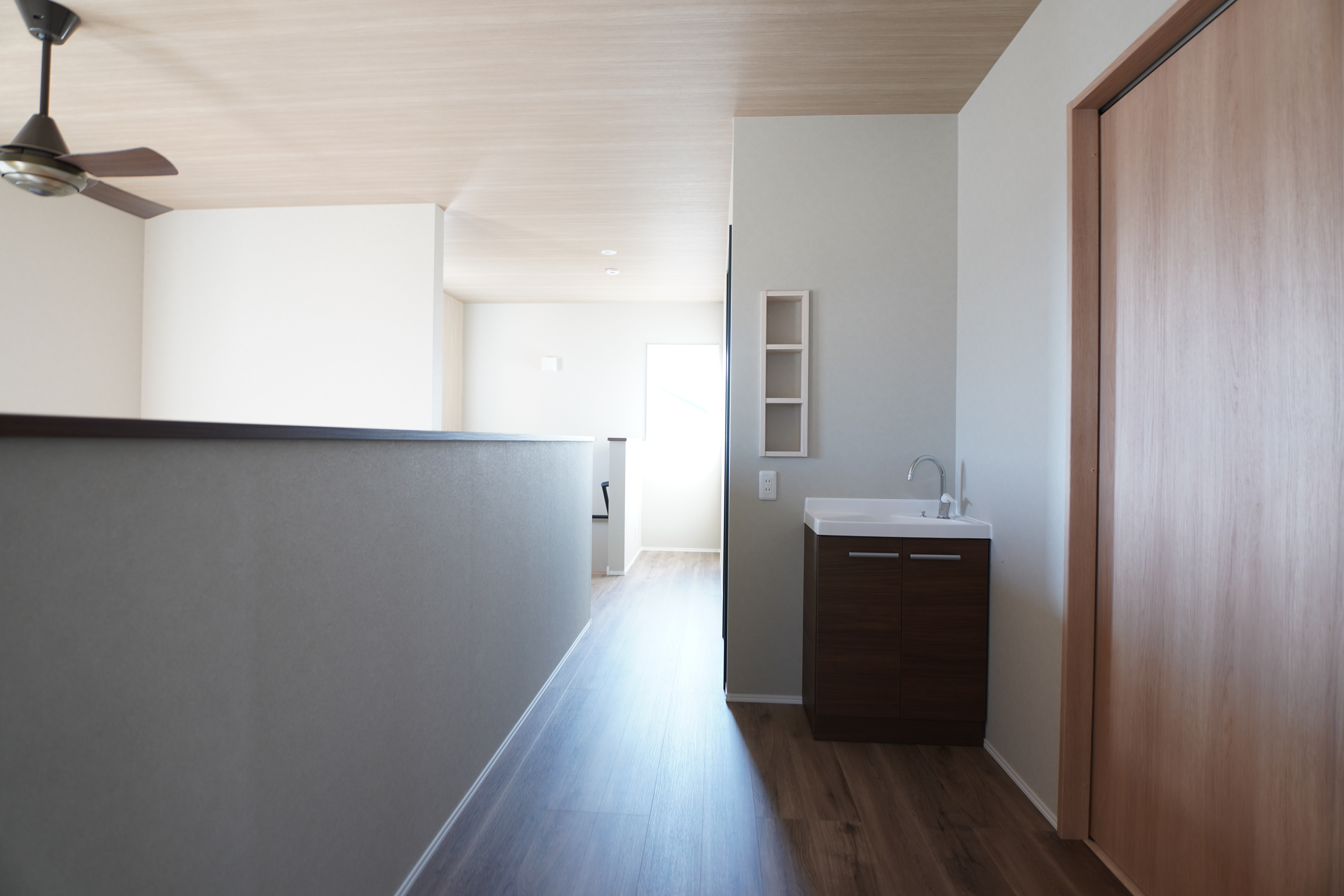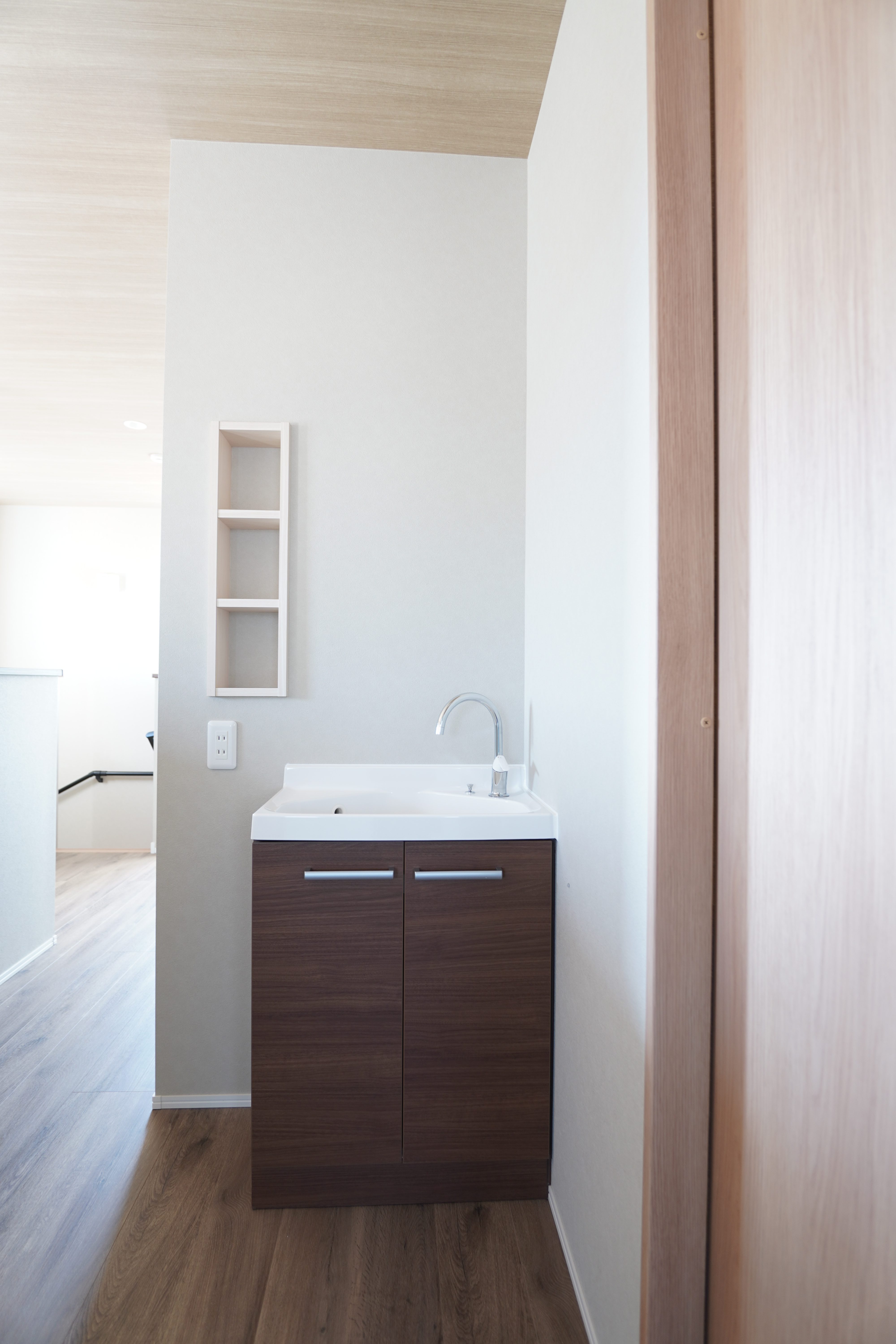 2階のホールには、コンパクトながら機能的な洗面台を設けました。