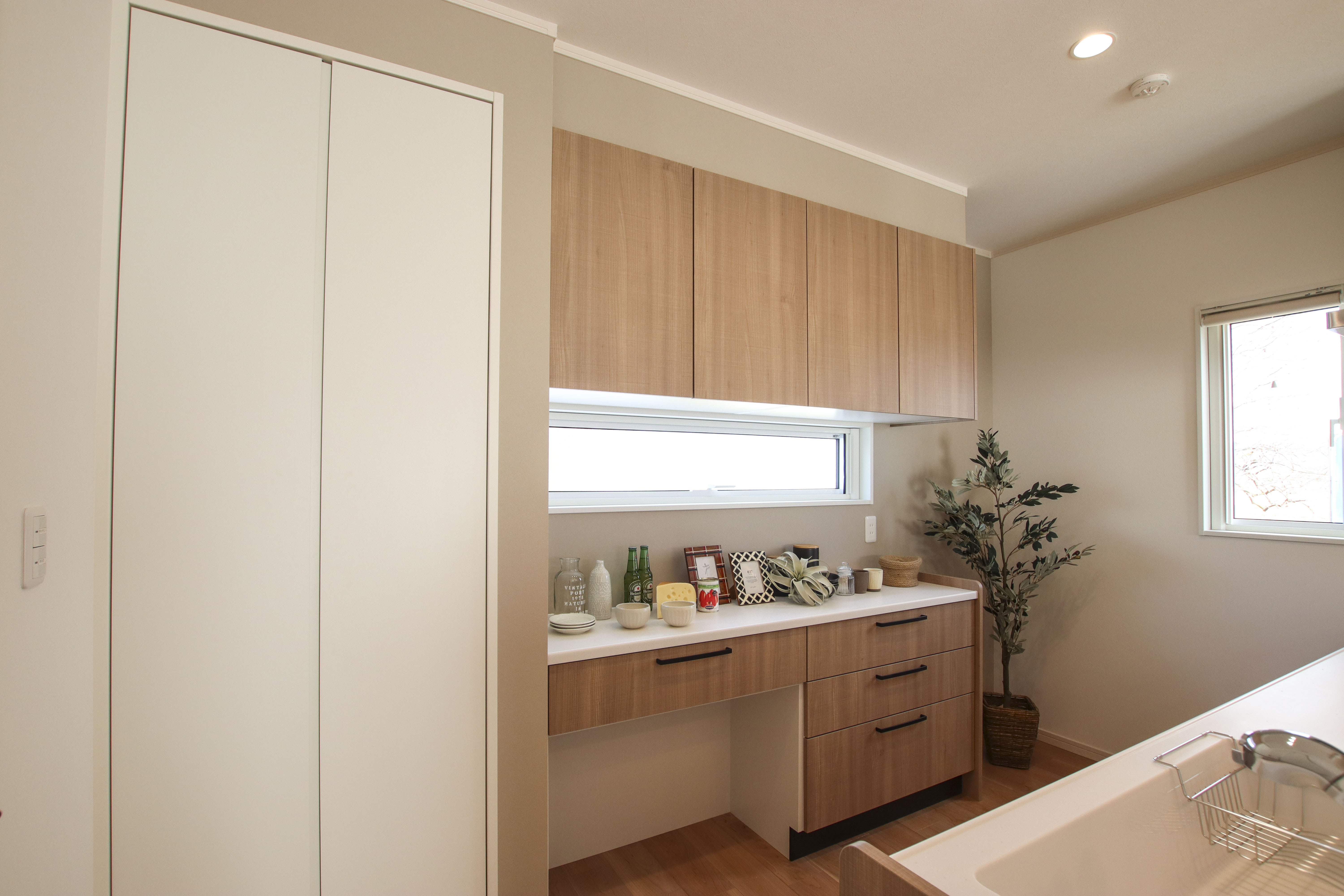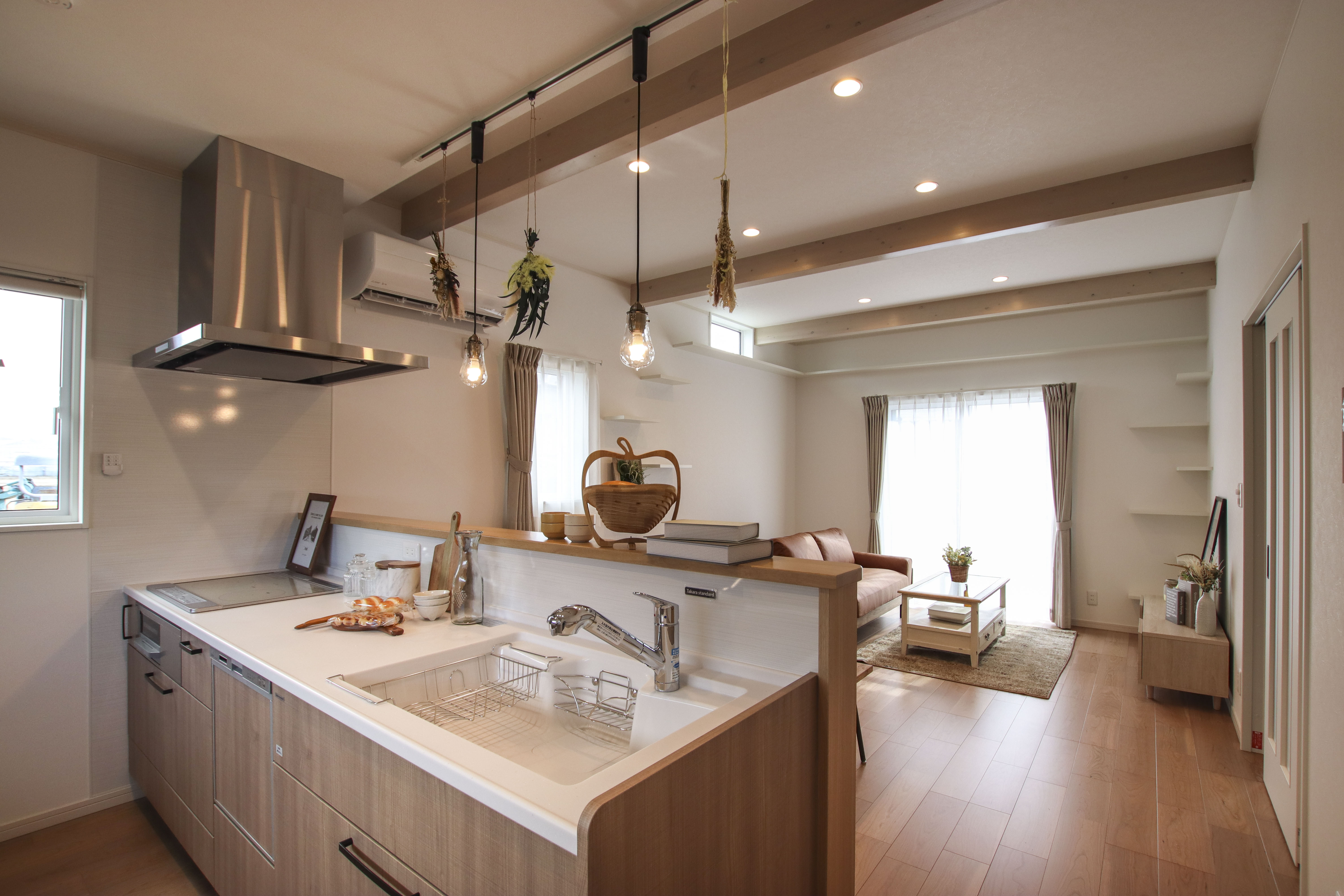 カントリー調のかわいらしい印象ですがキッチン部分のモルタル風の腰壁がお部屋を立体的に見せてくれます。